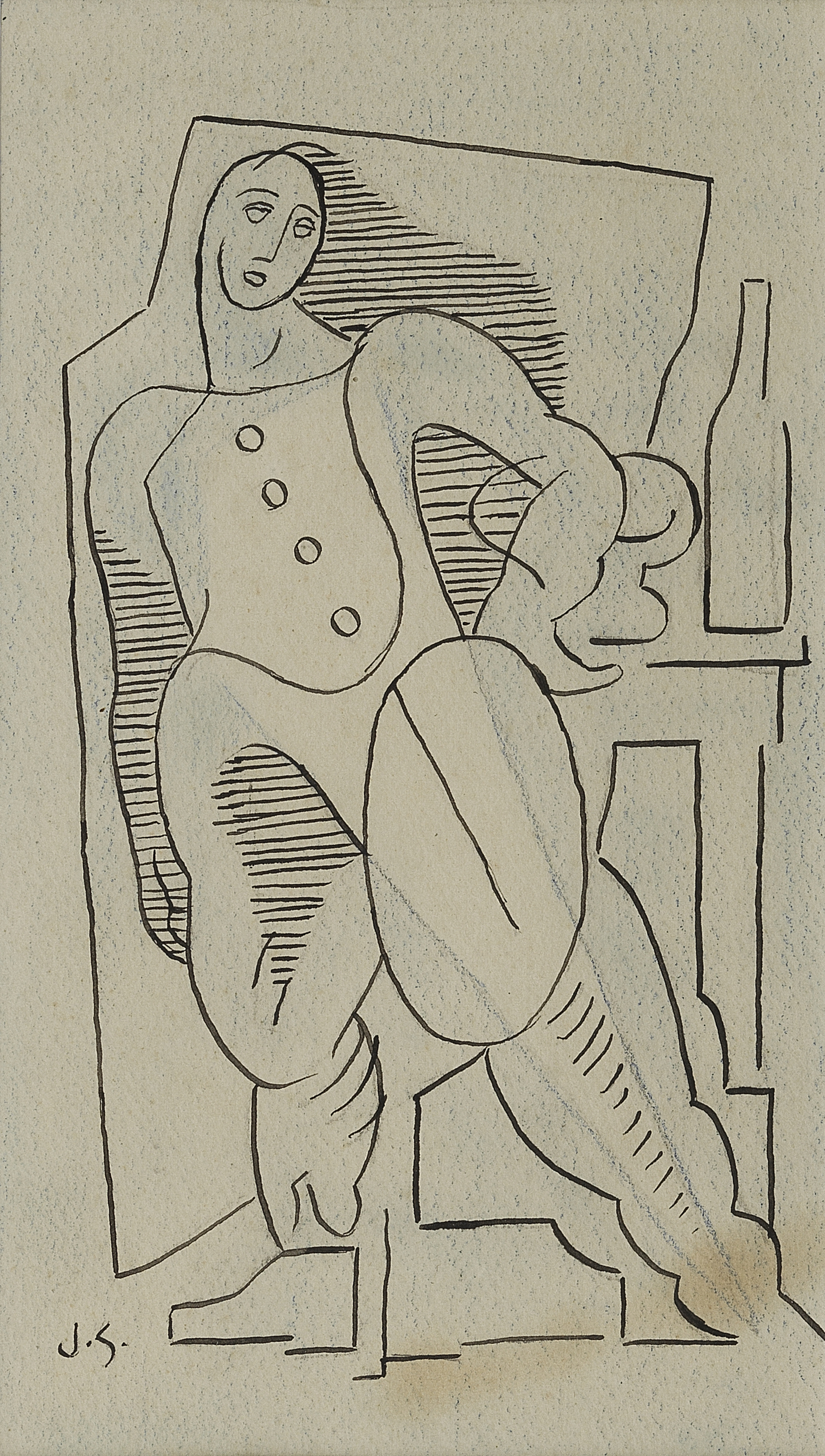 Pierrot à la guitare, feutre et crayon, monogrammé J.G, 22x13 cm...