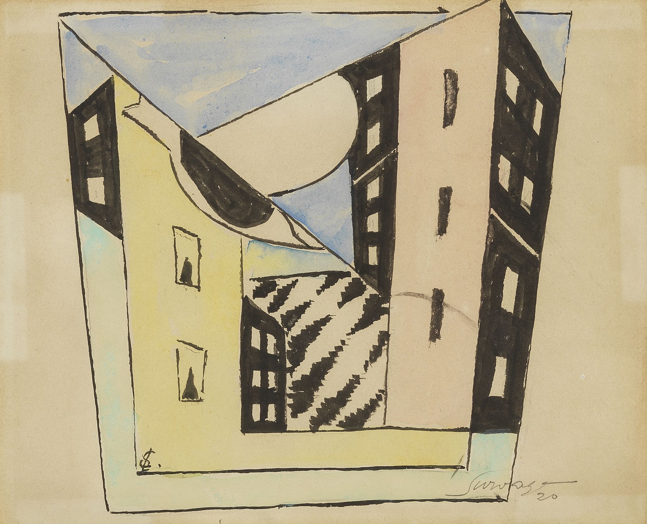 Composition architecturale, encre et aquarelle sur papier, signé...