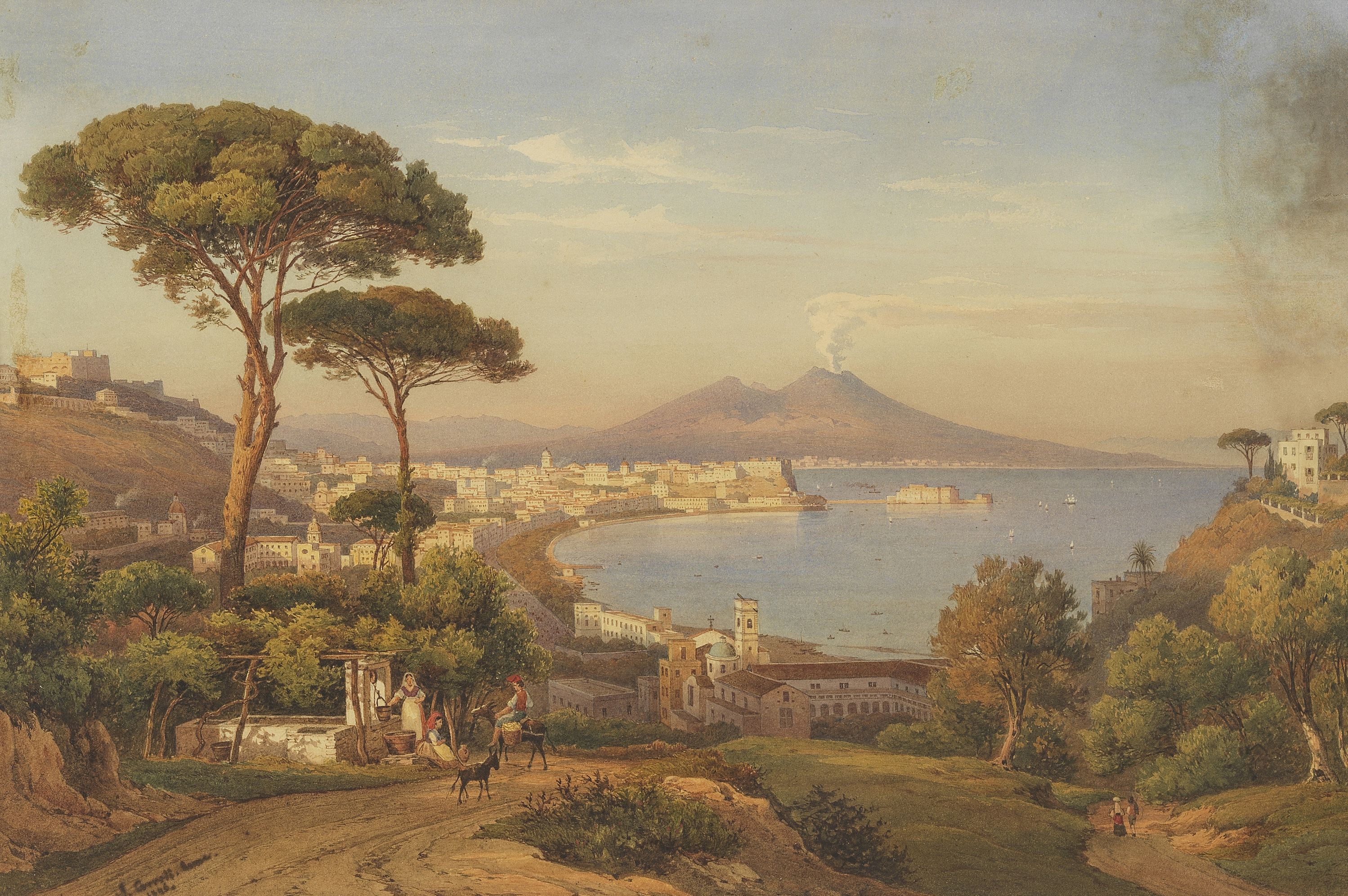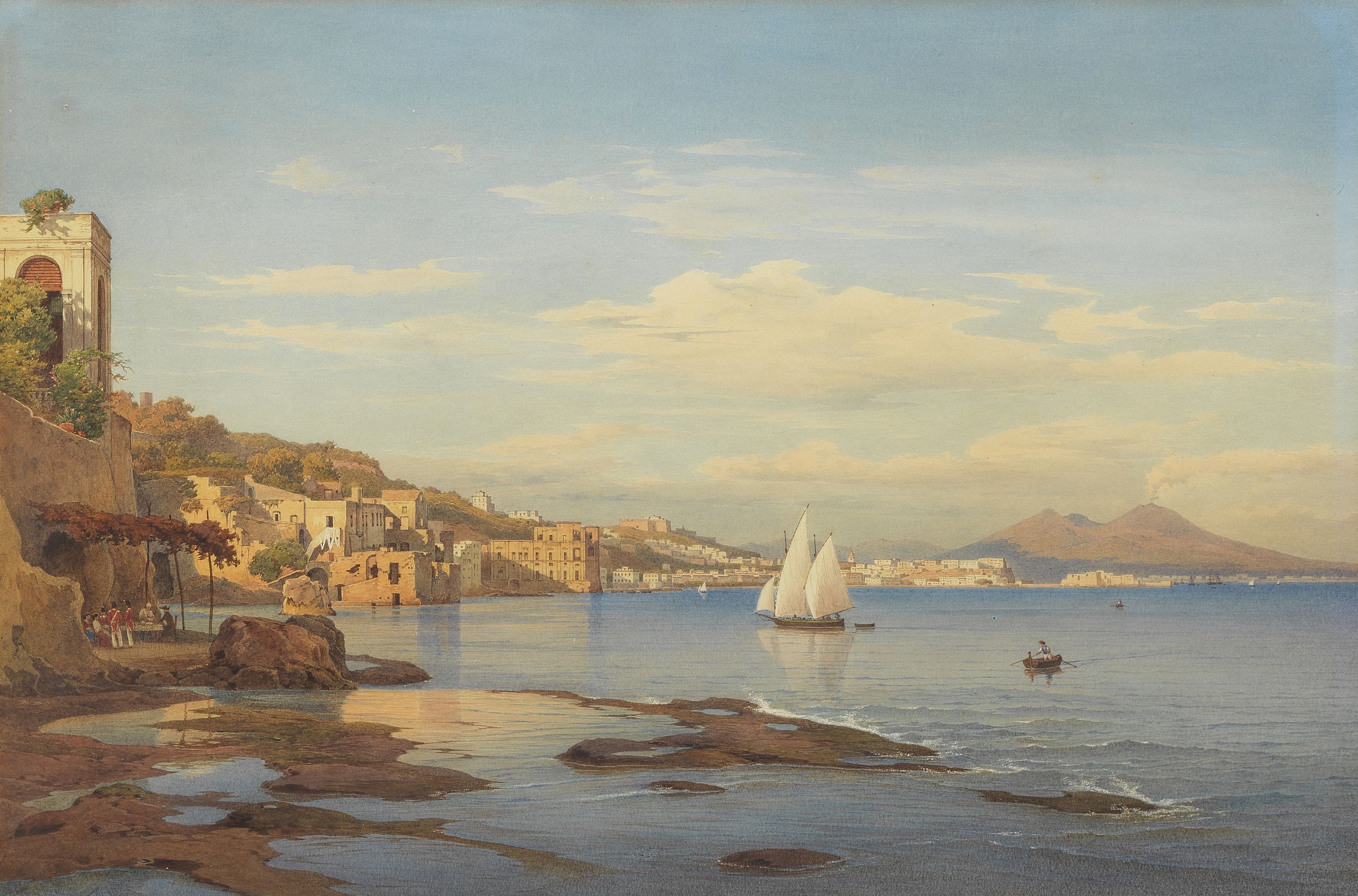 Vue de Naples avec le Vésuve, aquarelle sur papier, signée et da...
