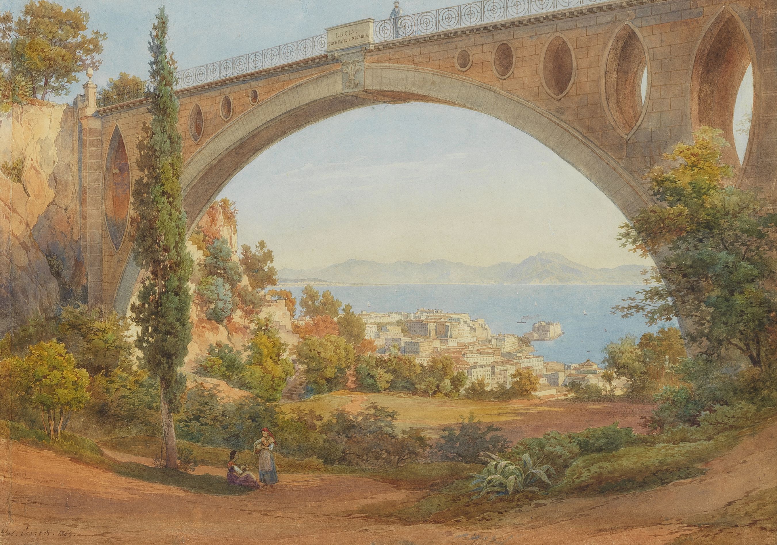Pont de Posi, aquarelle sur papier, signée et datée 1864, 32x45...