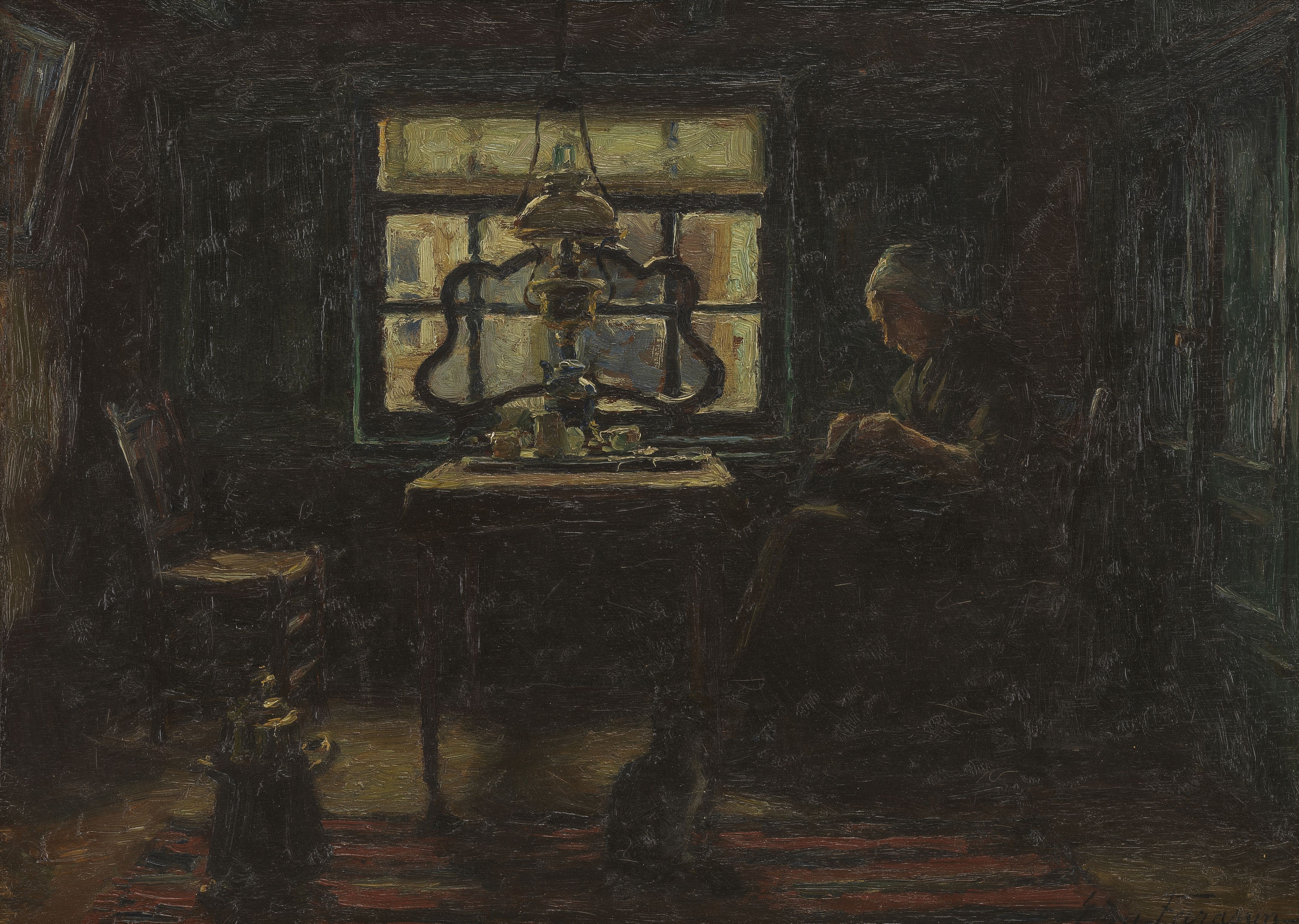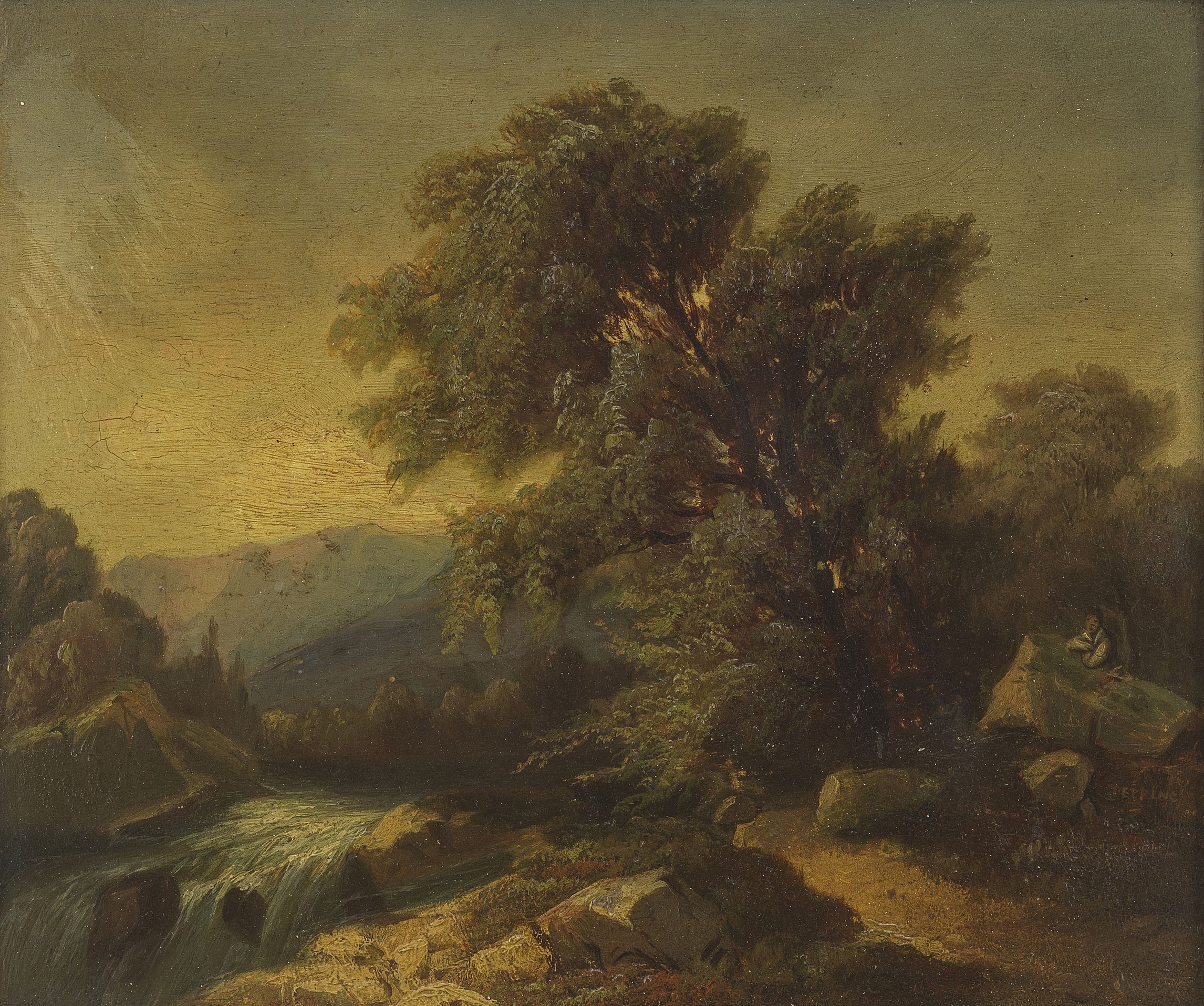 Pêcheur près d'un arbre au clair de lune, huile sur panneau, 21,...