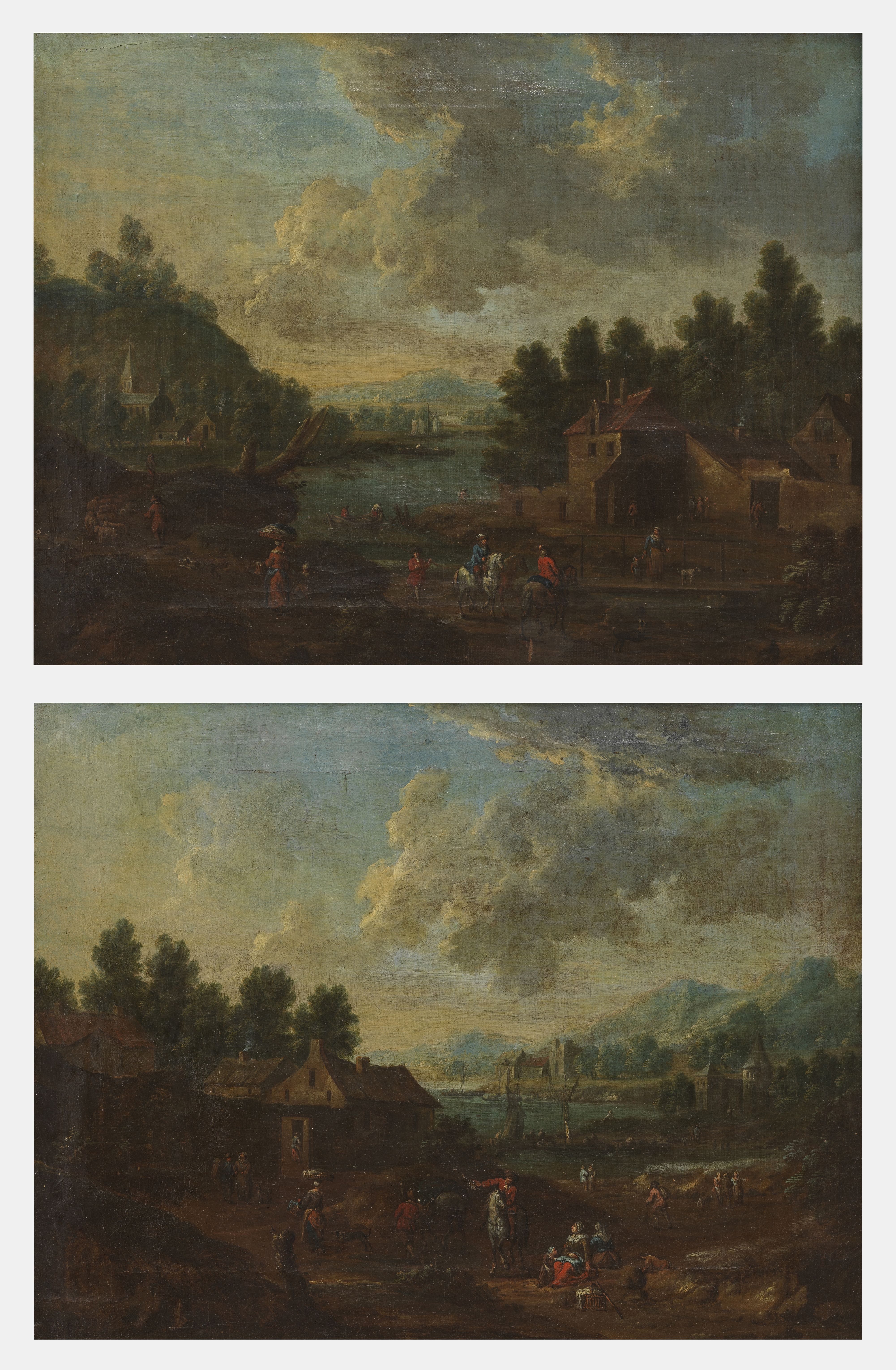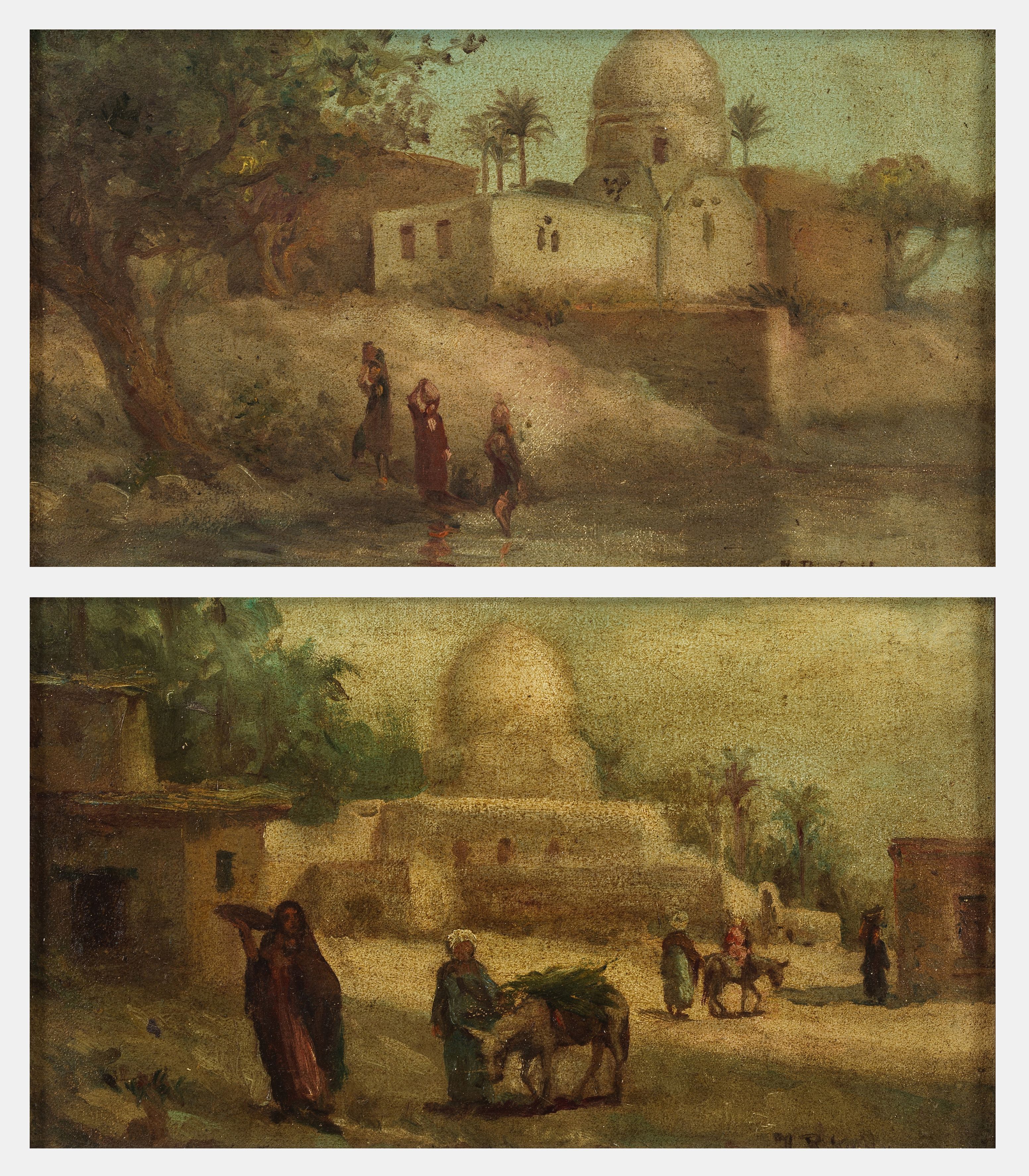 Deux paysages orientalistes animés, paire d'huiles sur panneaux,...