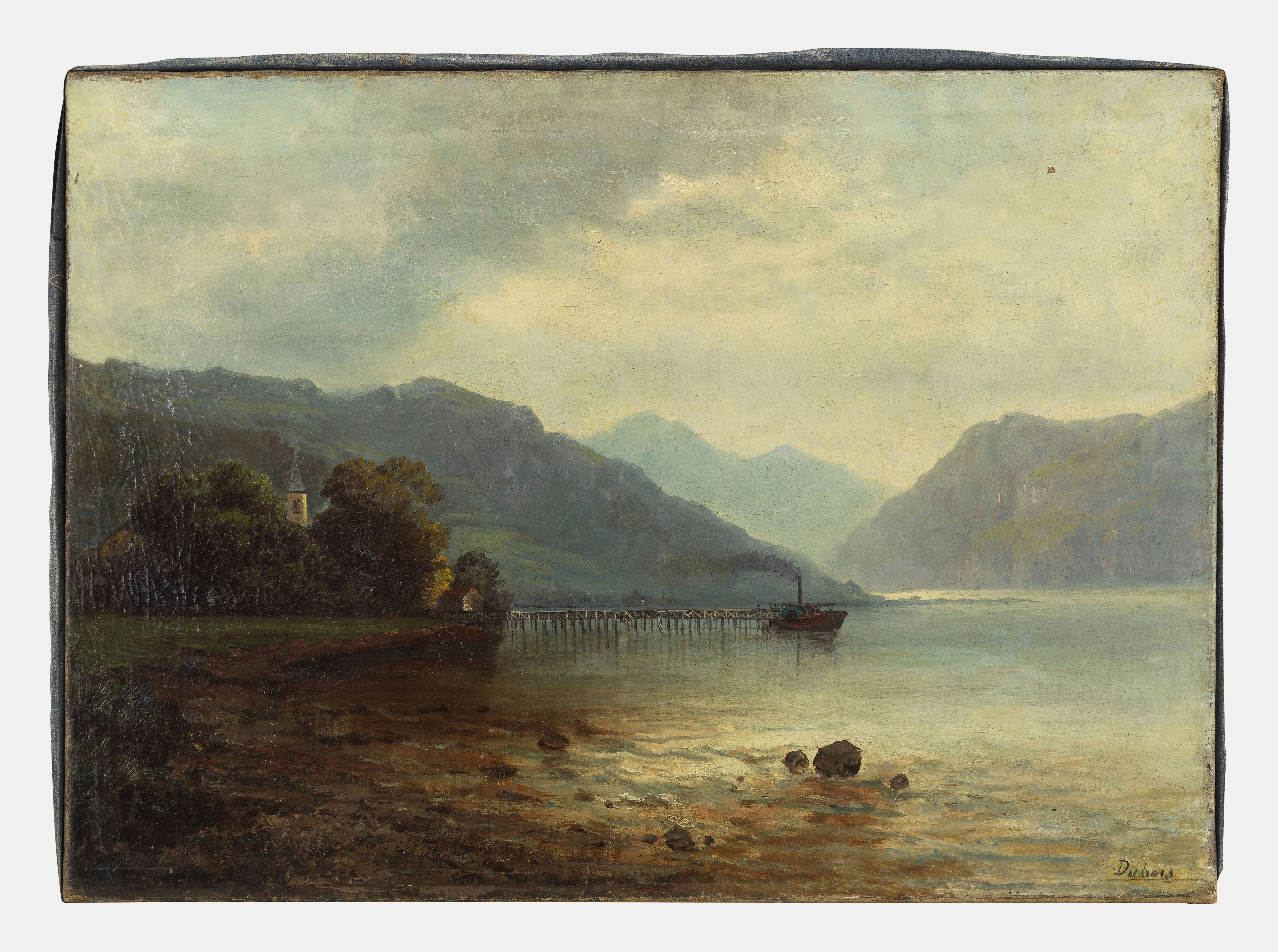 Bateau à vapeur sur le lac, huile sur toile, signée, 59x81 cm