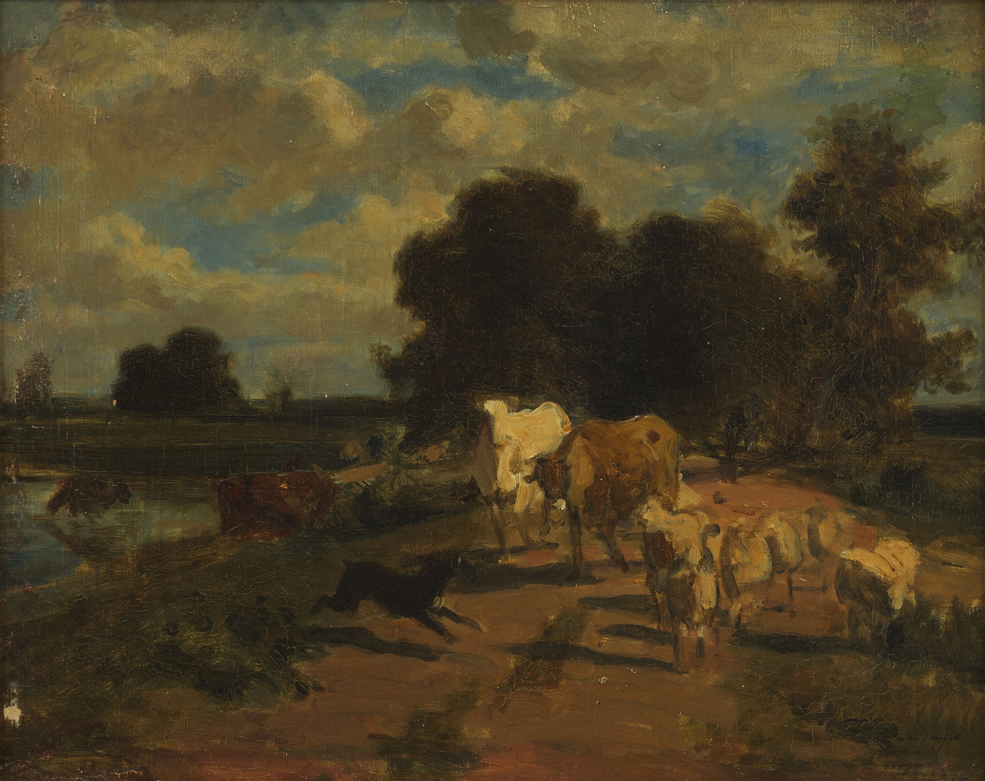 Vaches et bergers au pré, huile sur toile, 52x67 cm