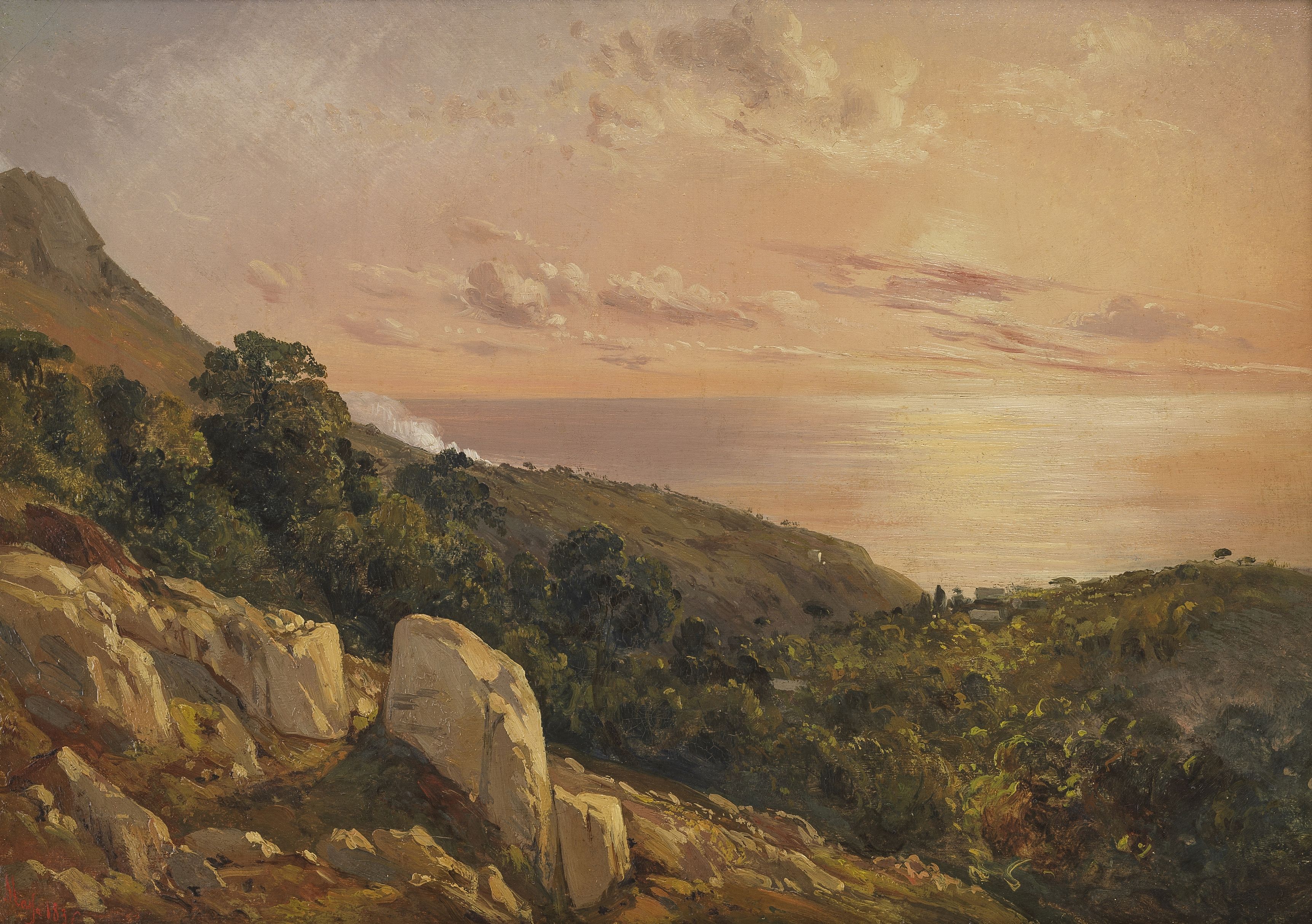 Vue de la mer au crépuscule , huile sur toile, signée Marfa, 183...