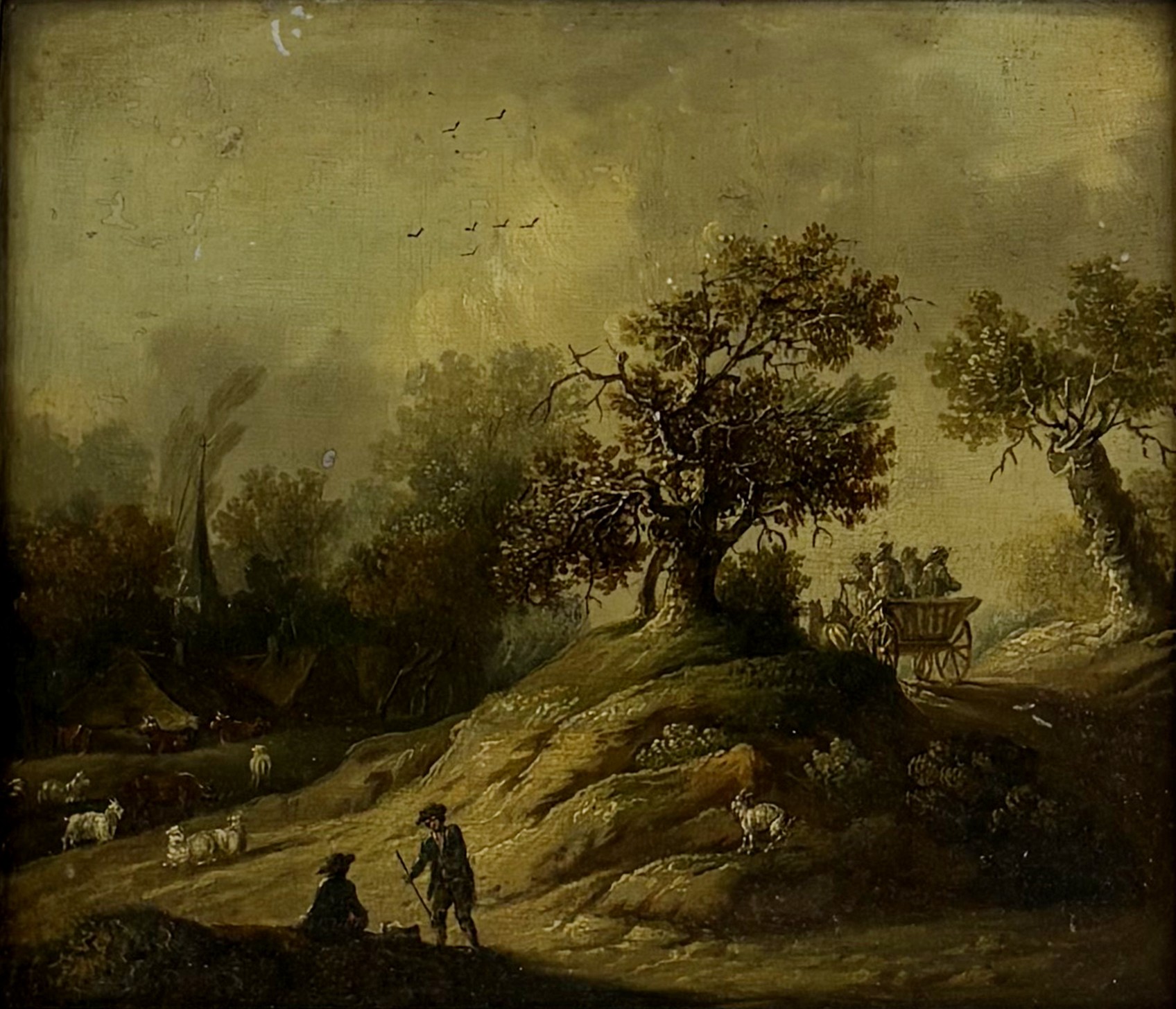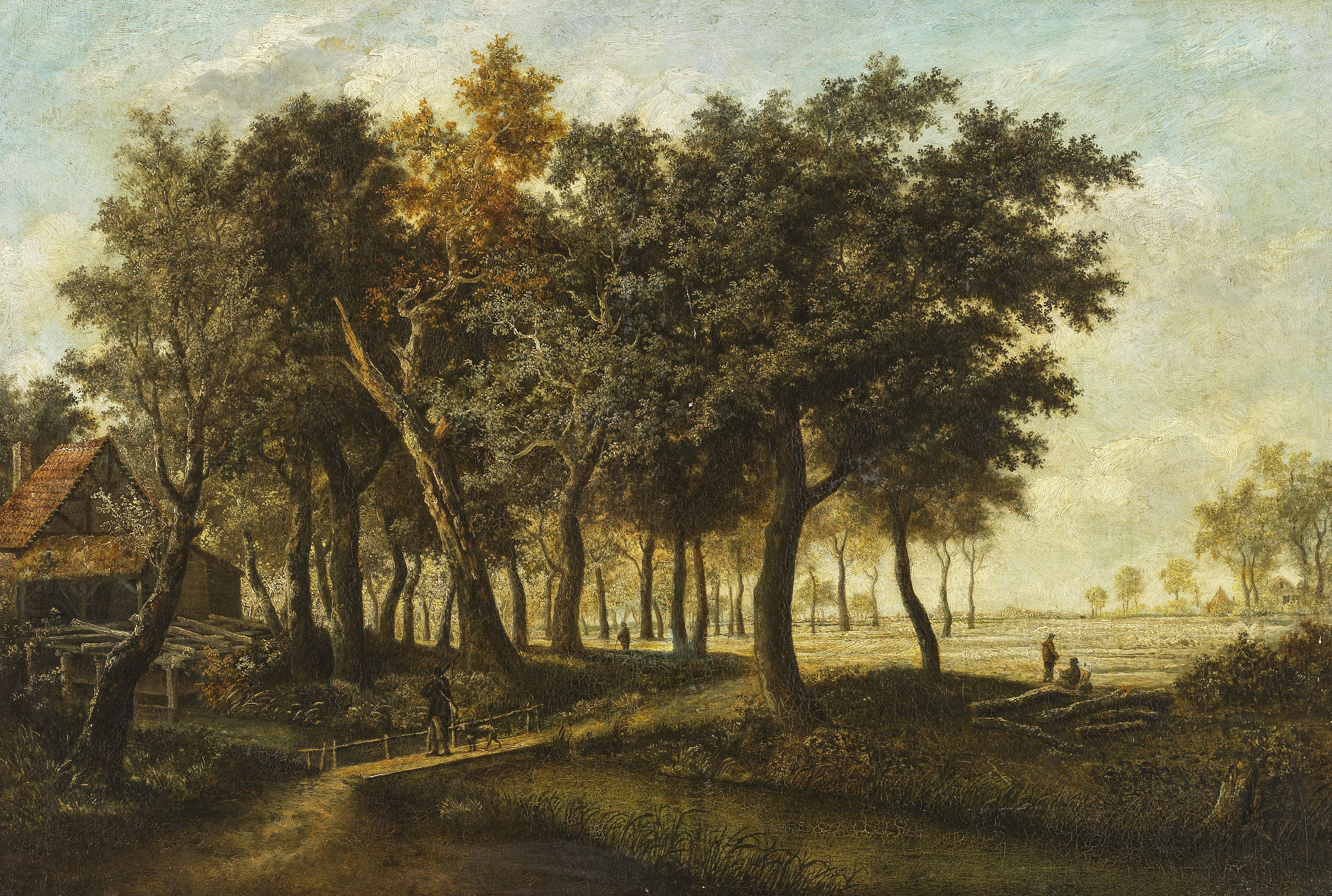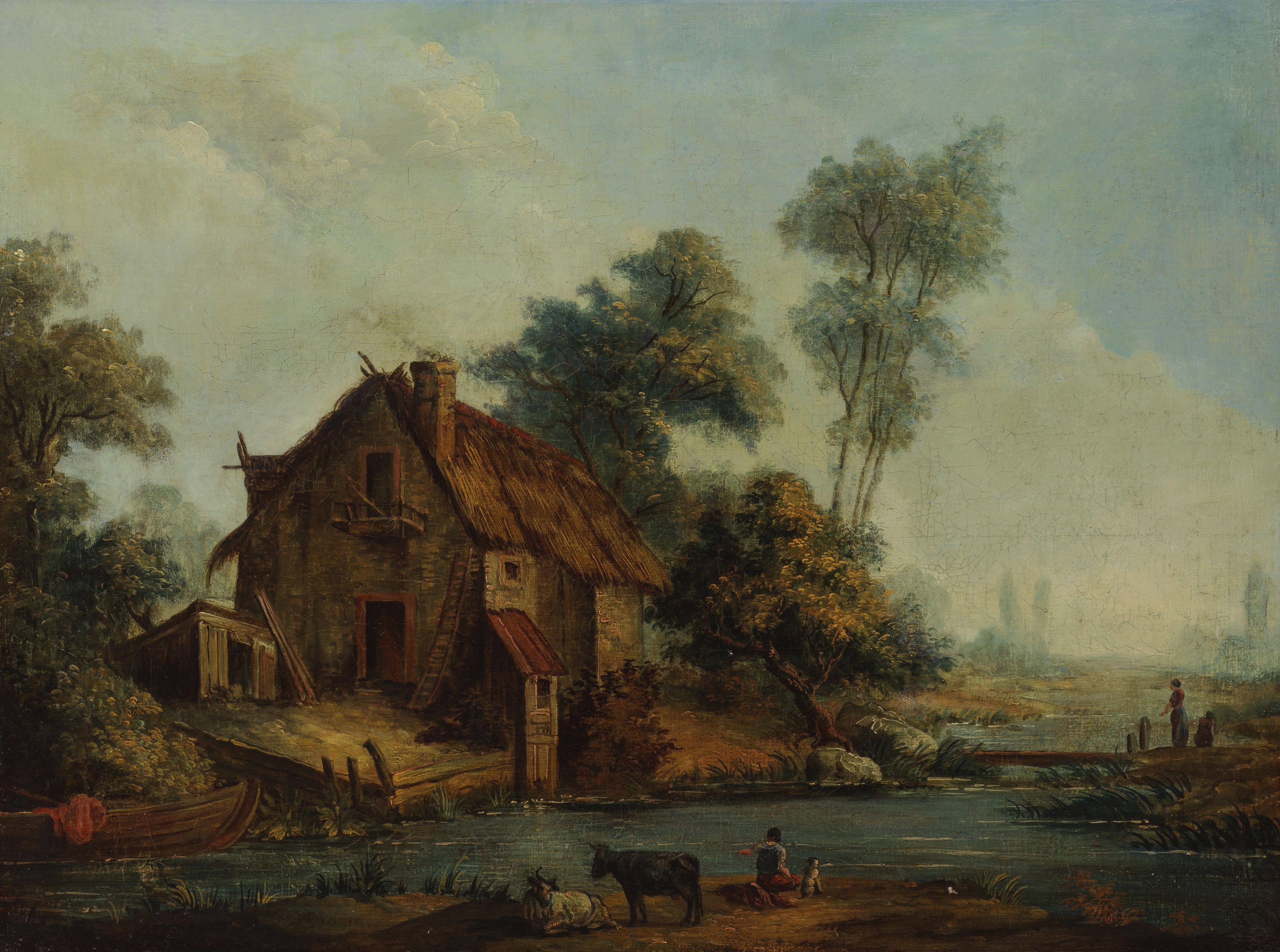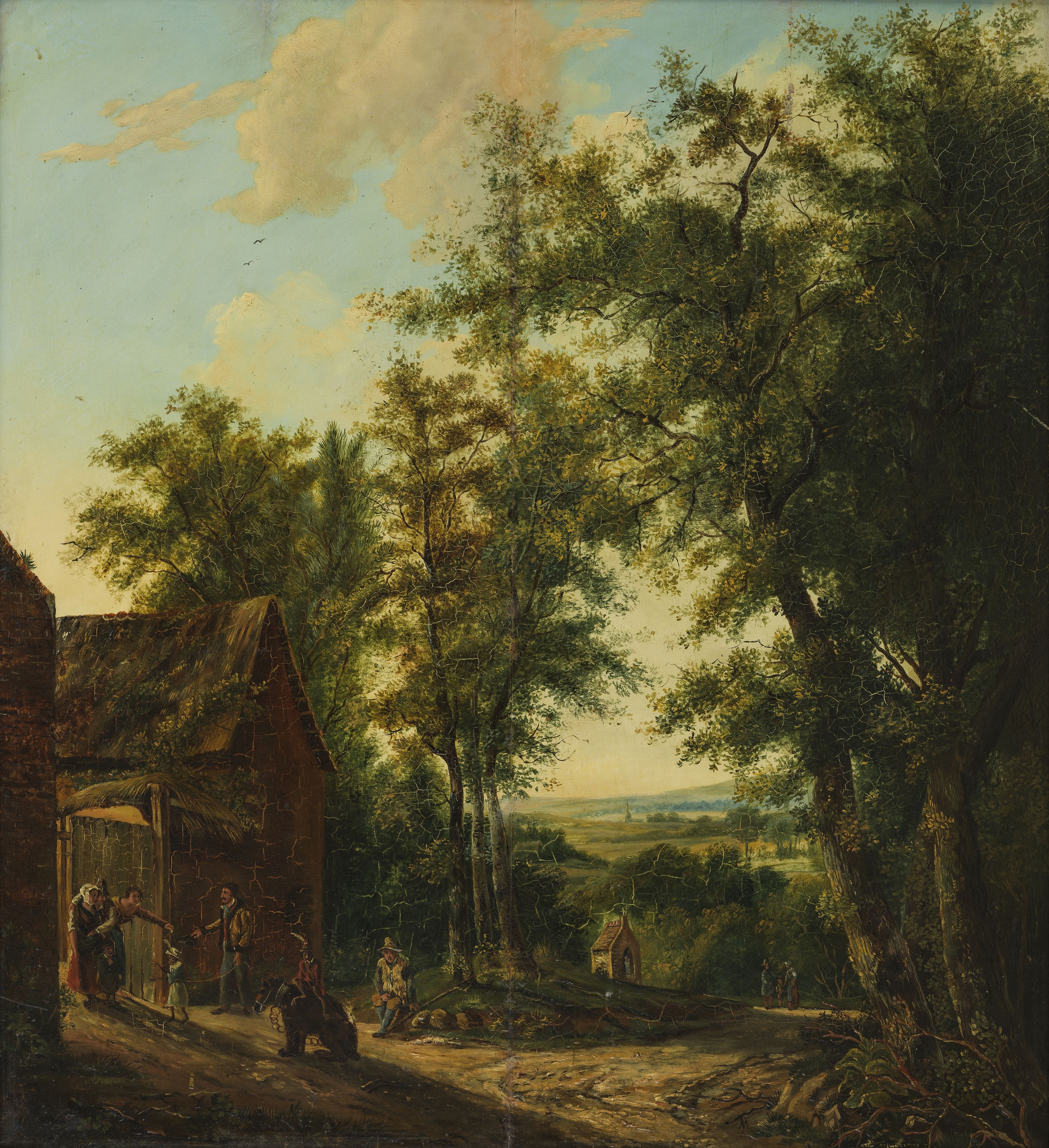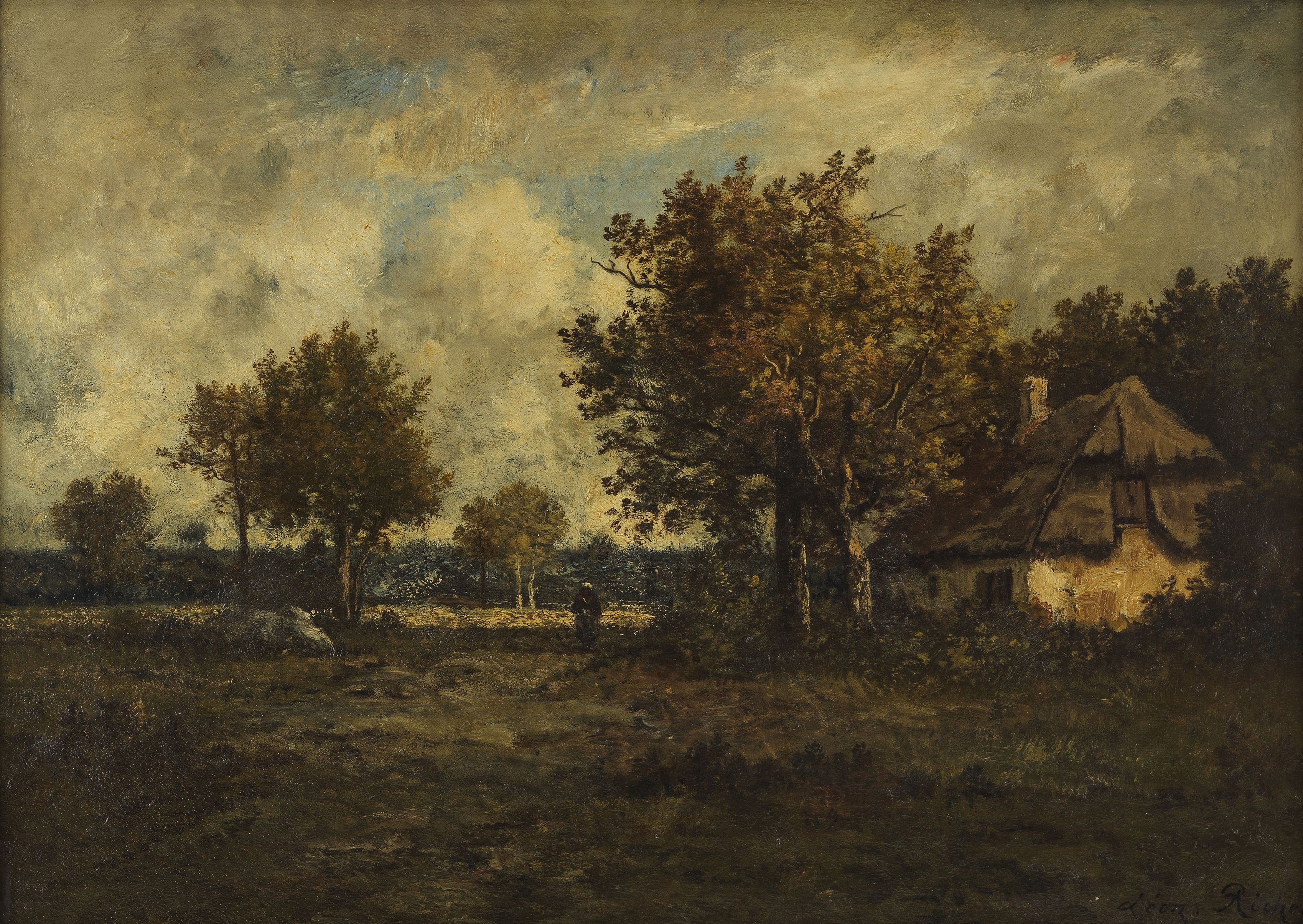 Paysage animé à la chaumière, huile sur toile, signée, 48x58 cm
