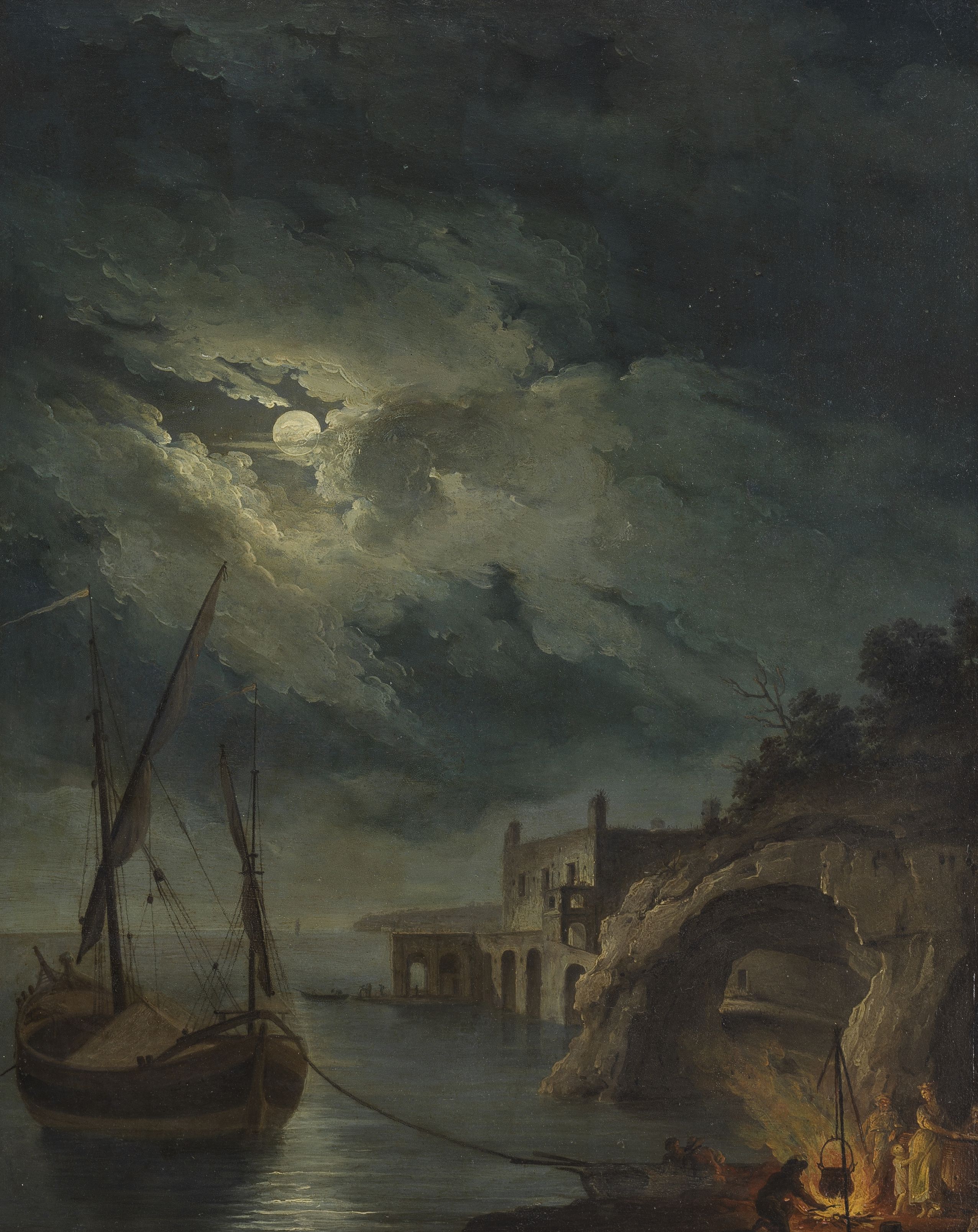 Repas au clair de lune au bord de la mer, huile sur cuivre, 55x4...