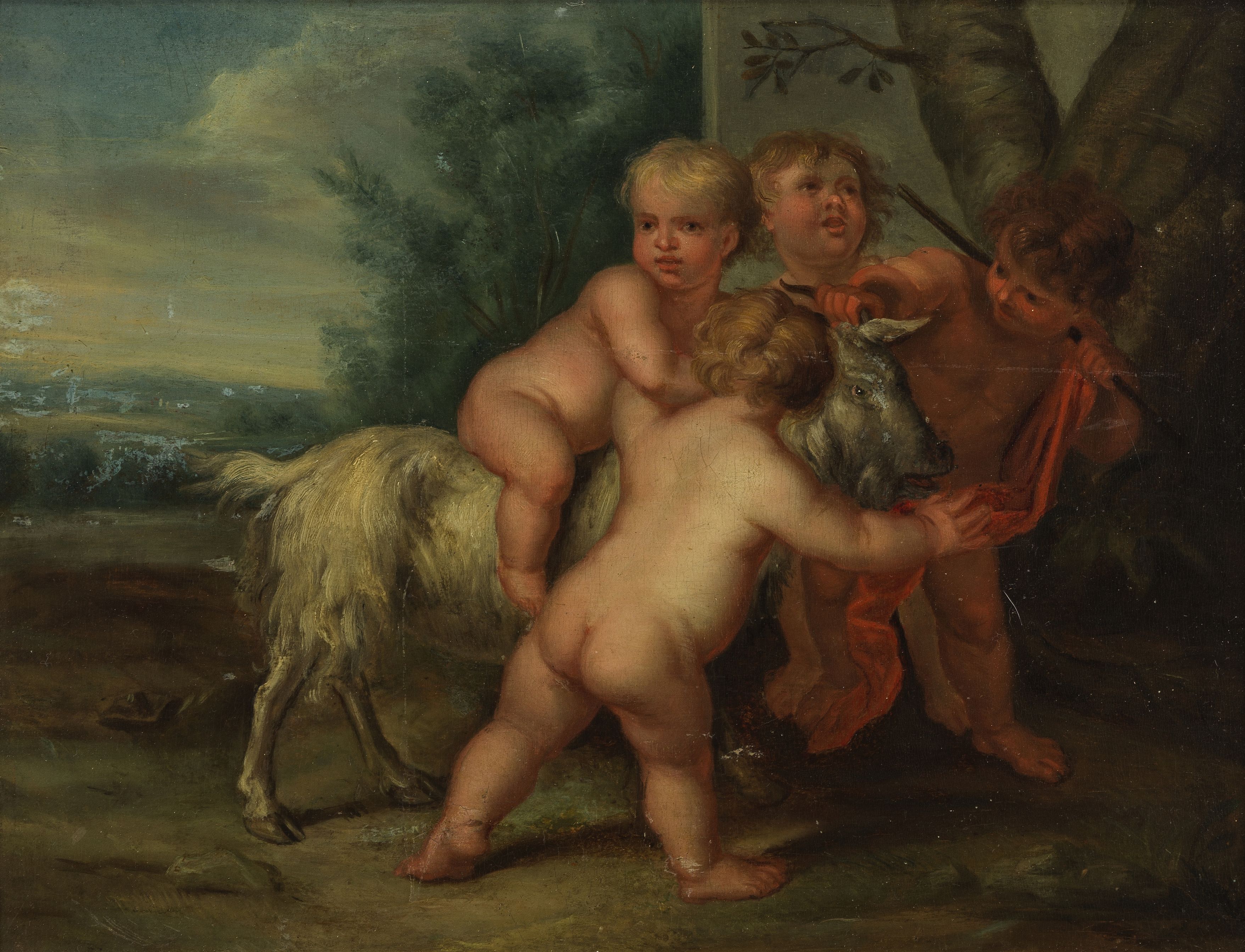 Putti jouant avec un bouc, huile sur panneau, 30x40 cm
