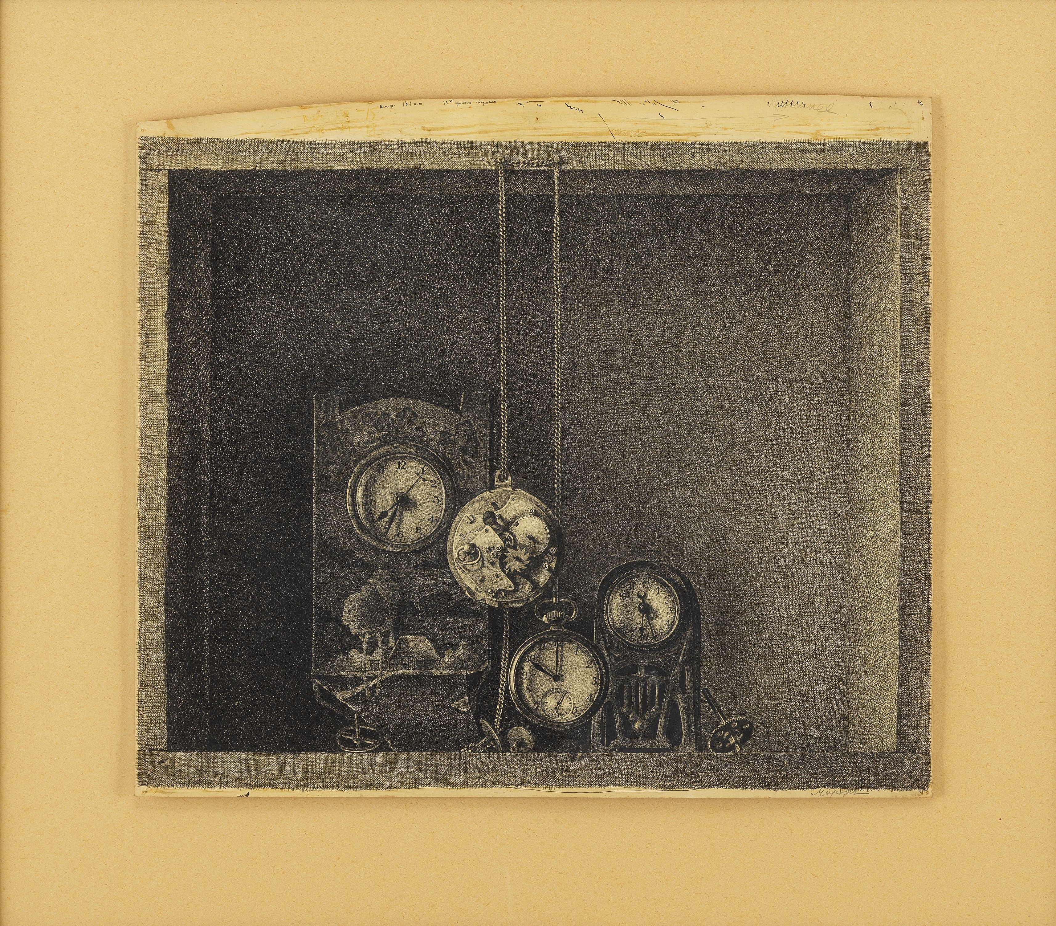 Nature morte aux montres, encre sur papier, signée Morosov, 35x4...