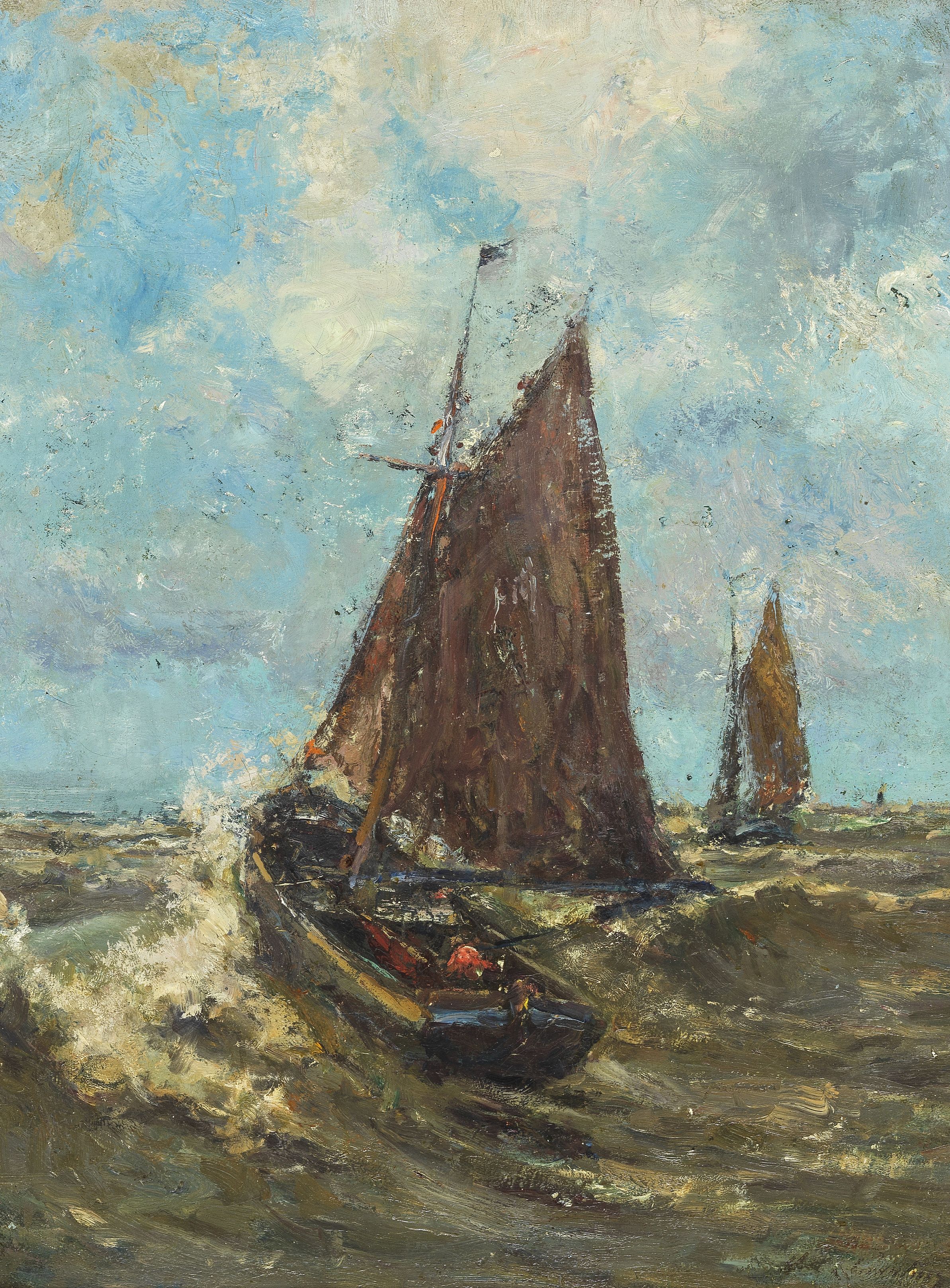Bâteau de pêcheur dans vague, huile sur toile, signature peu lis...
