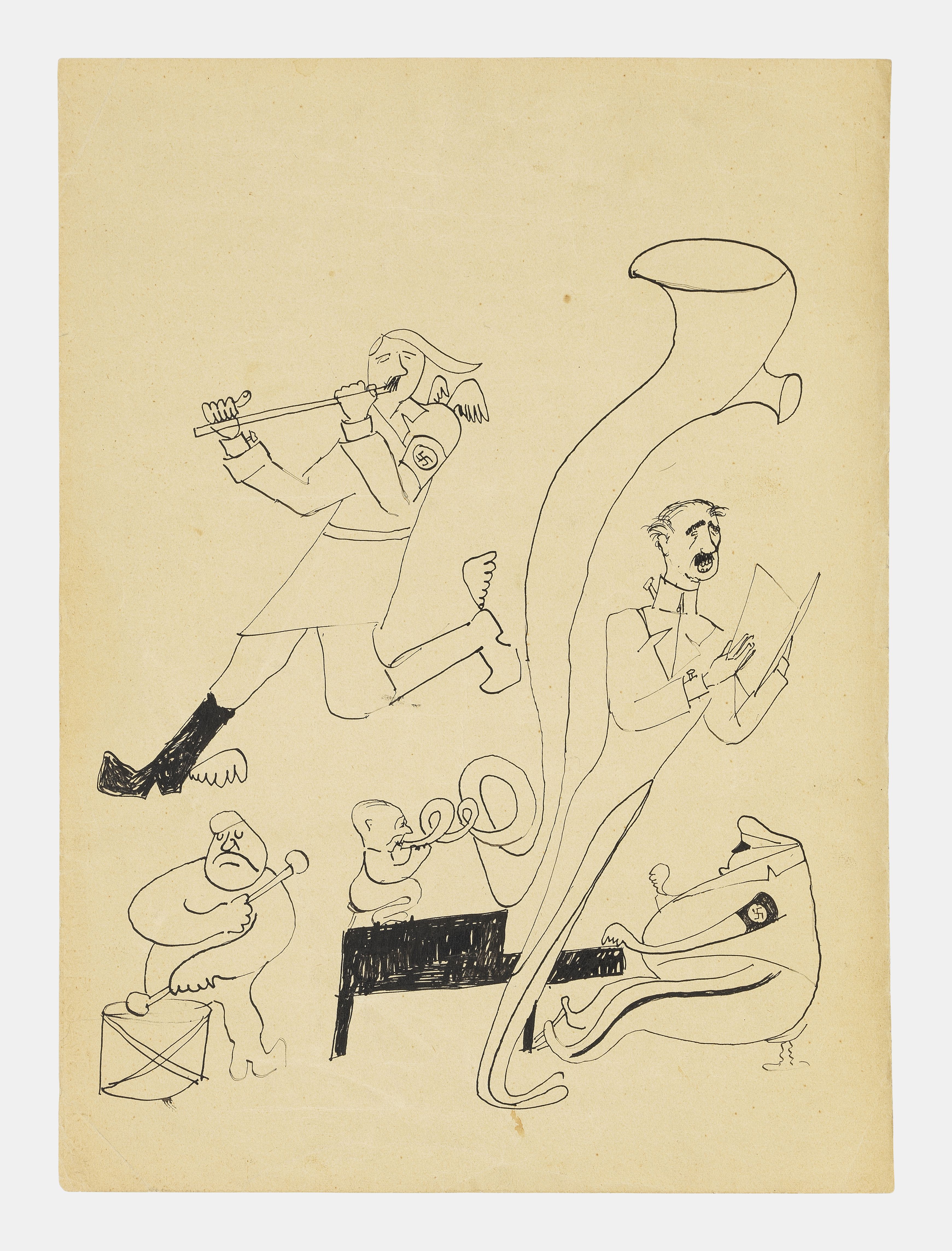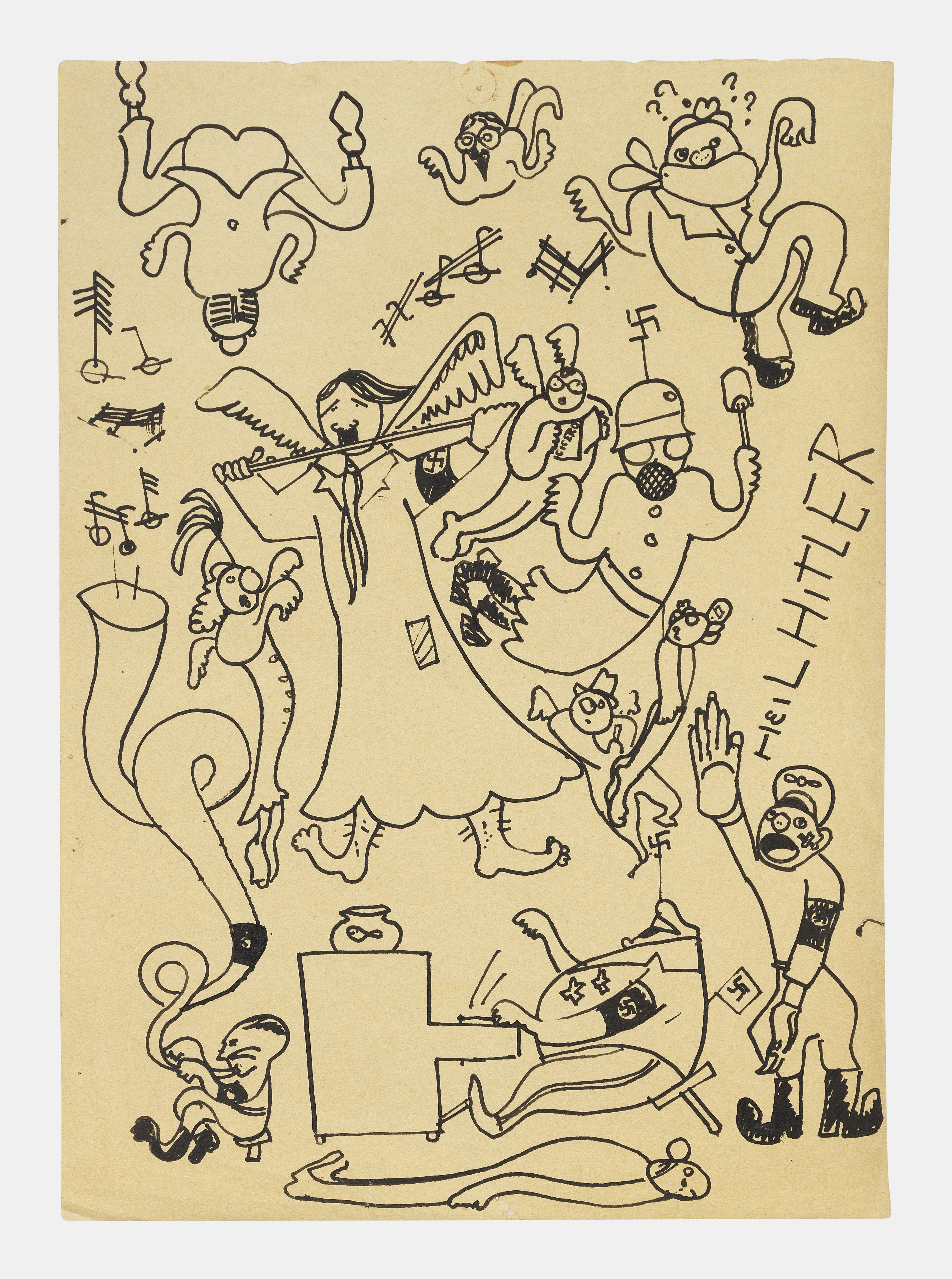Caricature avec Hitler ailé jouant de la flûte, feutre sur papie...
