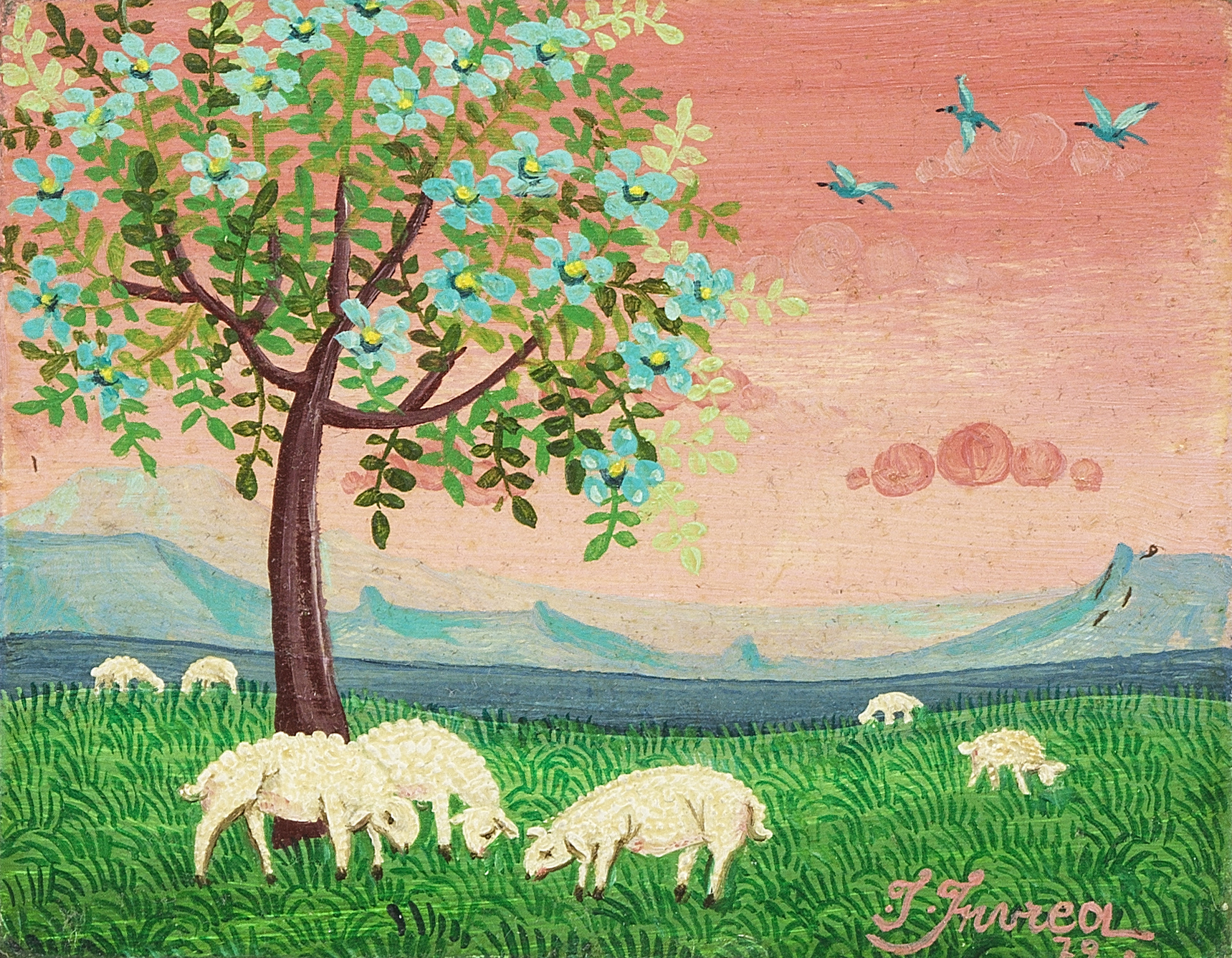 Moutons au paturage, huile sur panneau, signée et datée 79, 8x10...
