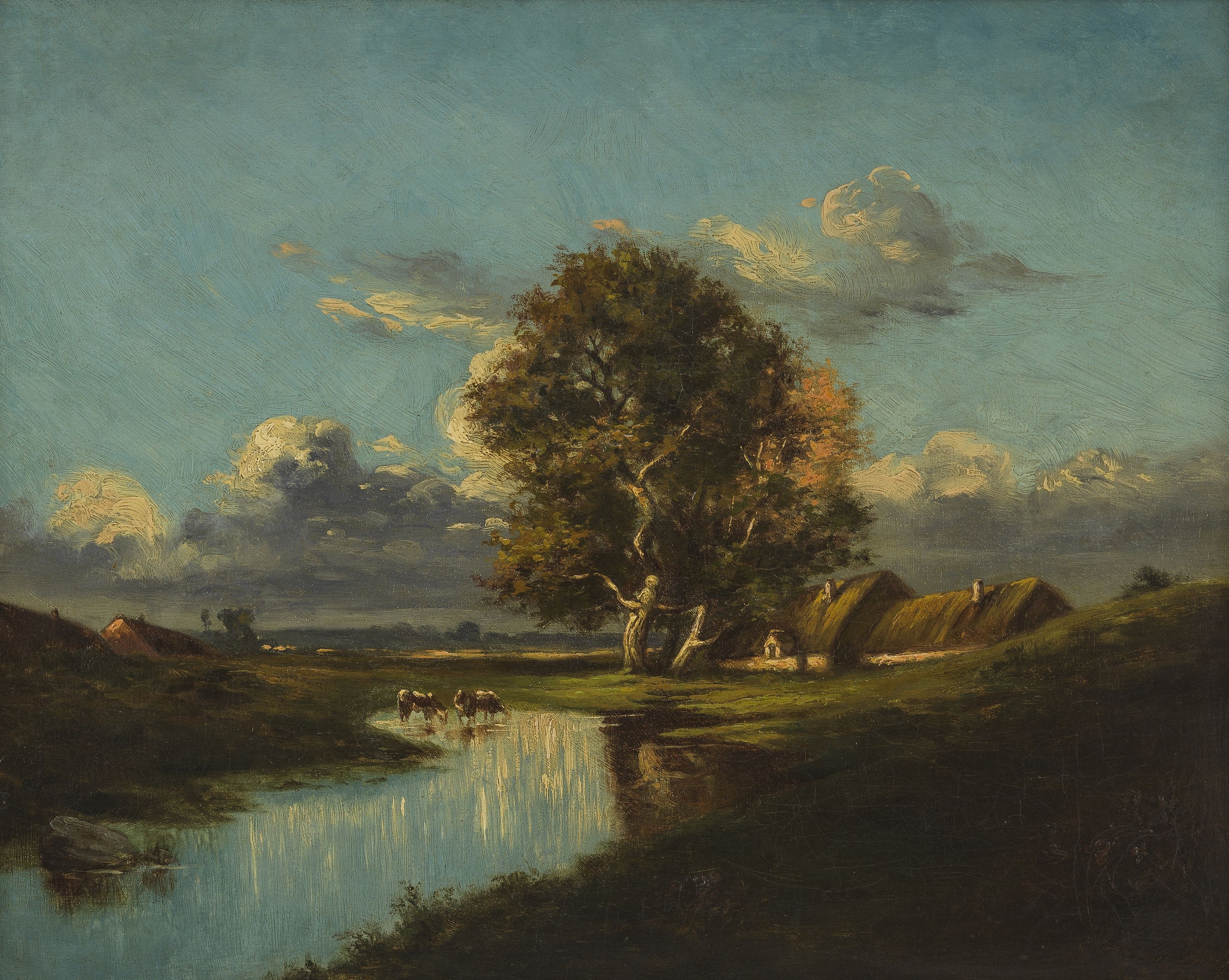 Vaches s'abreuvant près d'une maison, huile sur toile, 32x40 cm
