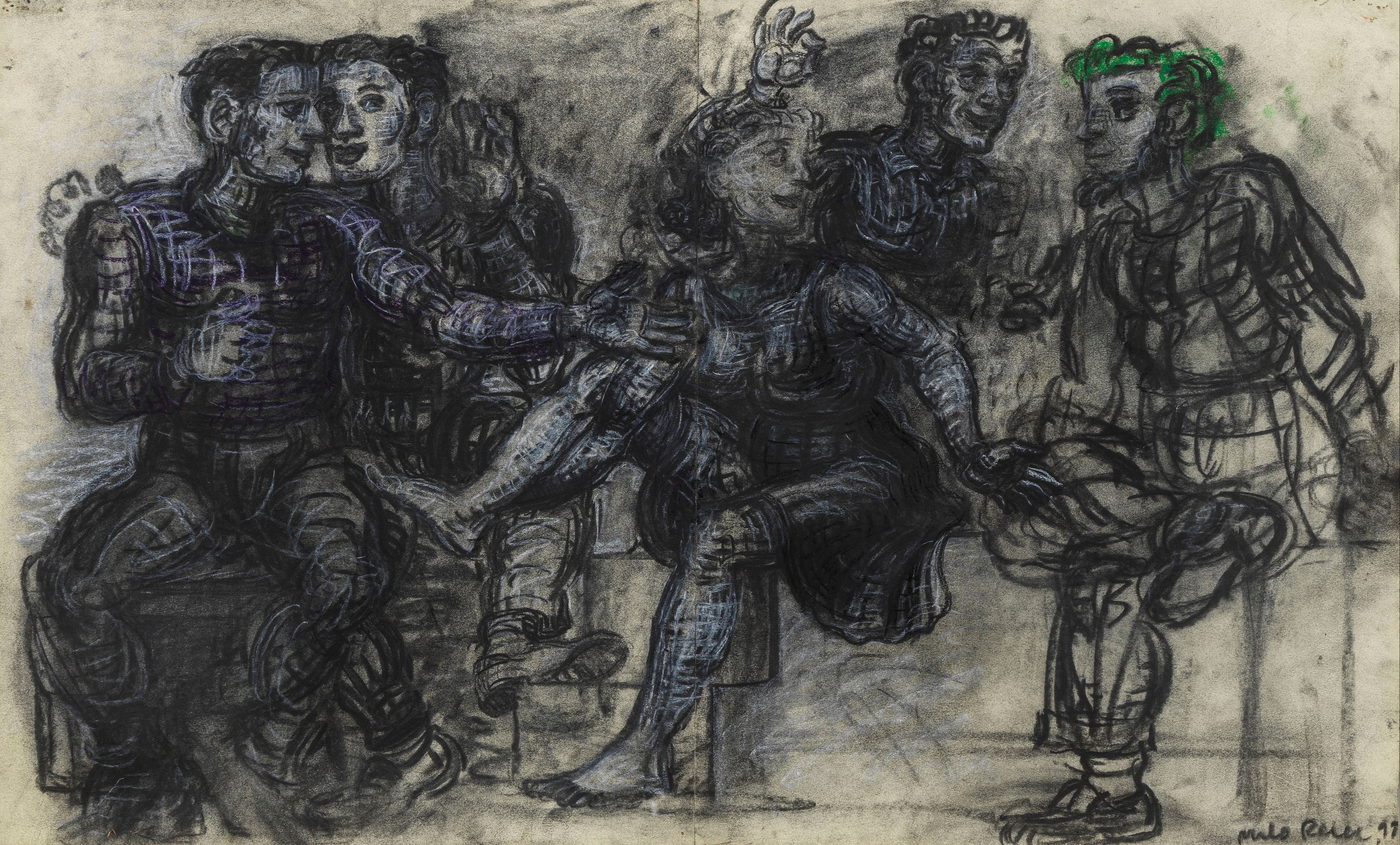 The Prophète in discussion with his followers, fusain, craie bla...