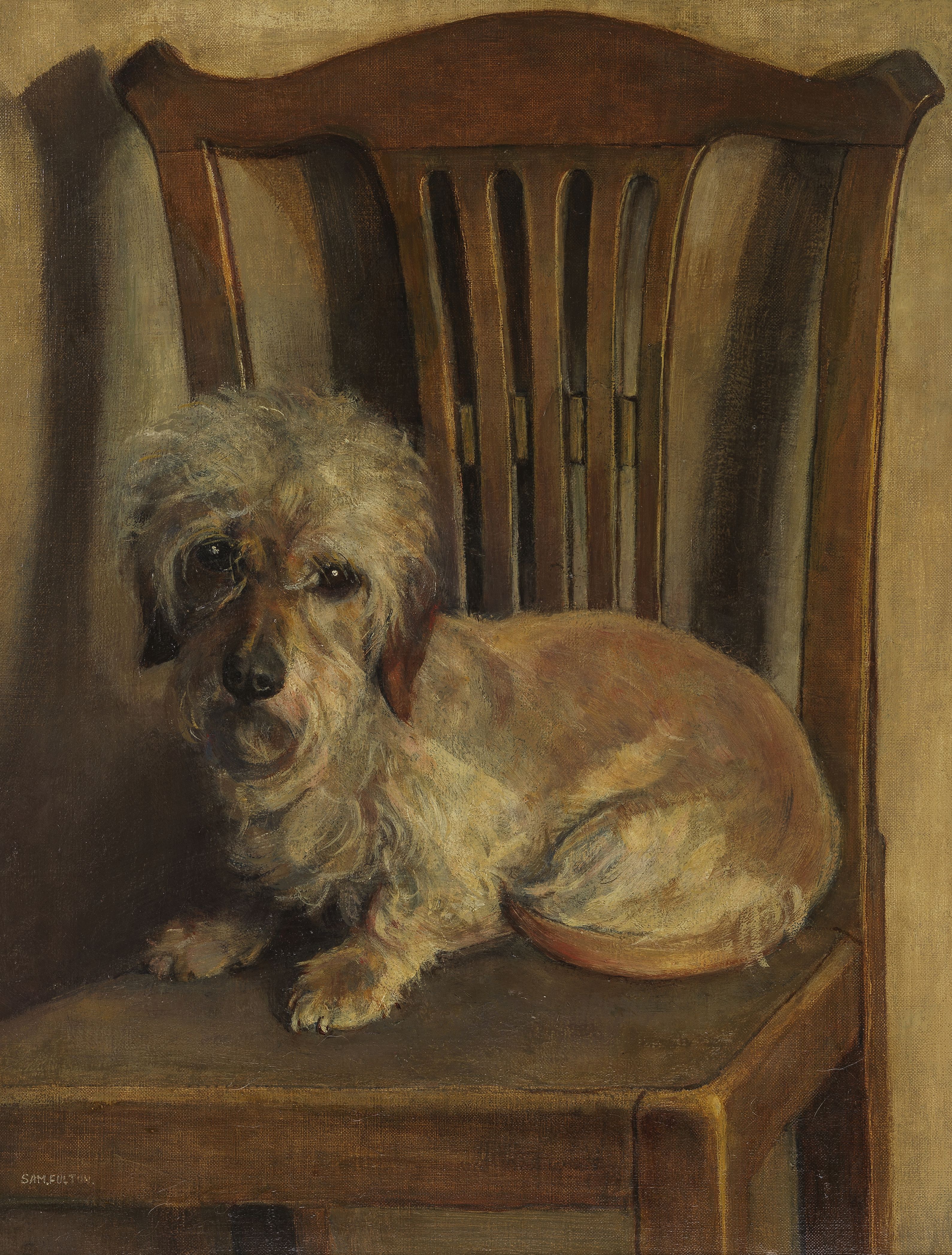 Portrait de Dandie Dinmont sur une chaise, huile sur toile, sign...