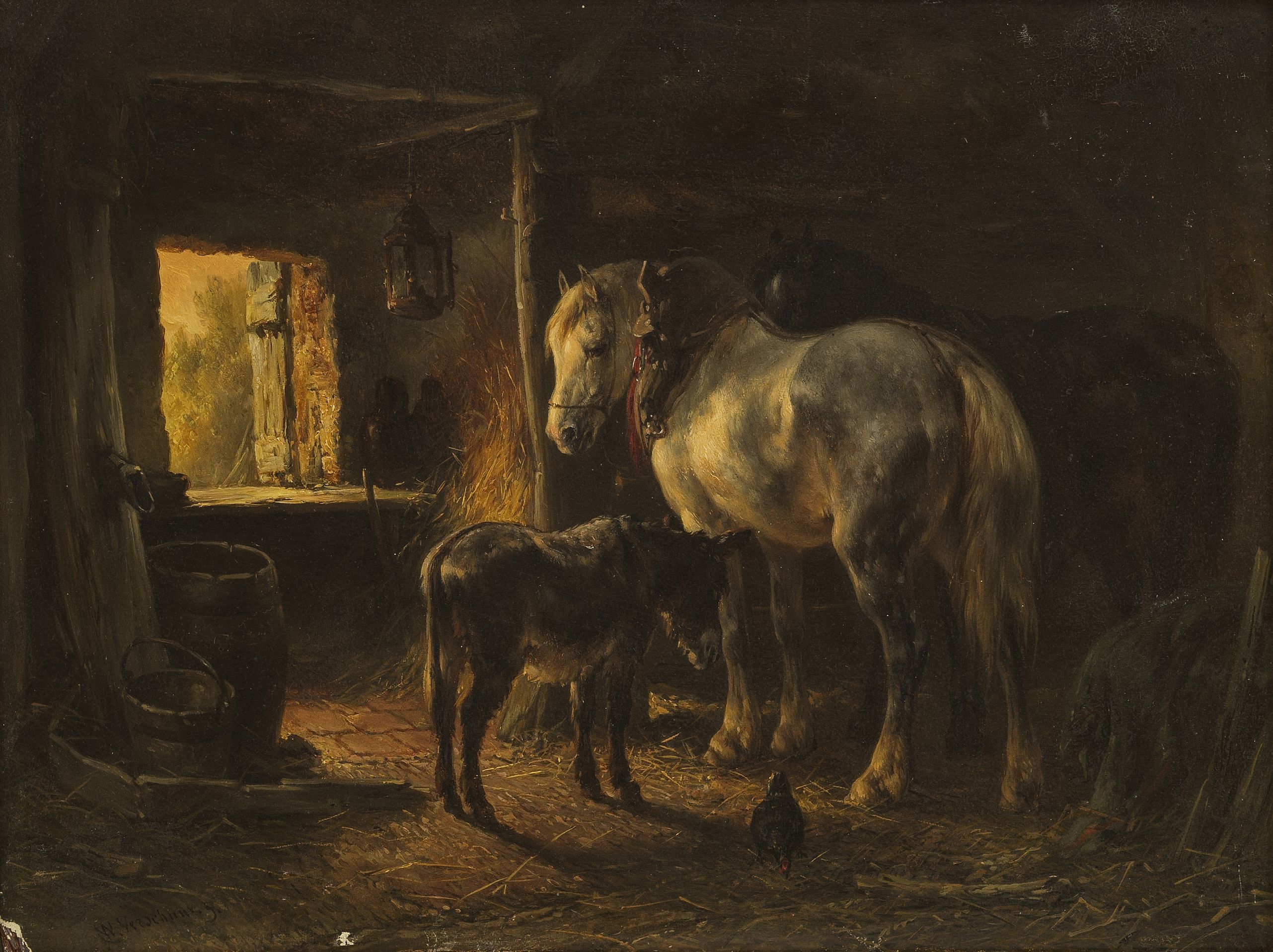 Écurie au crépuscule, huile sur panneau, signée, 21,5x28 cm