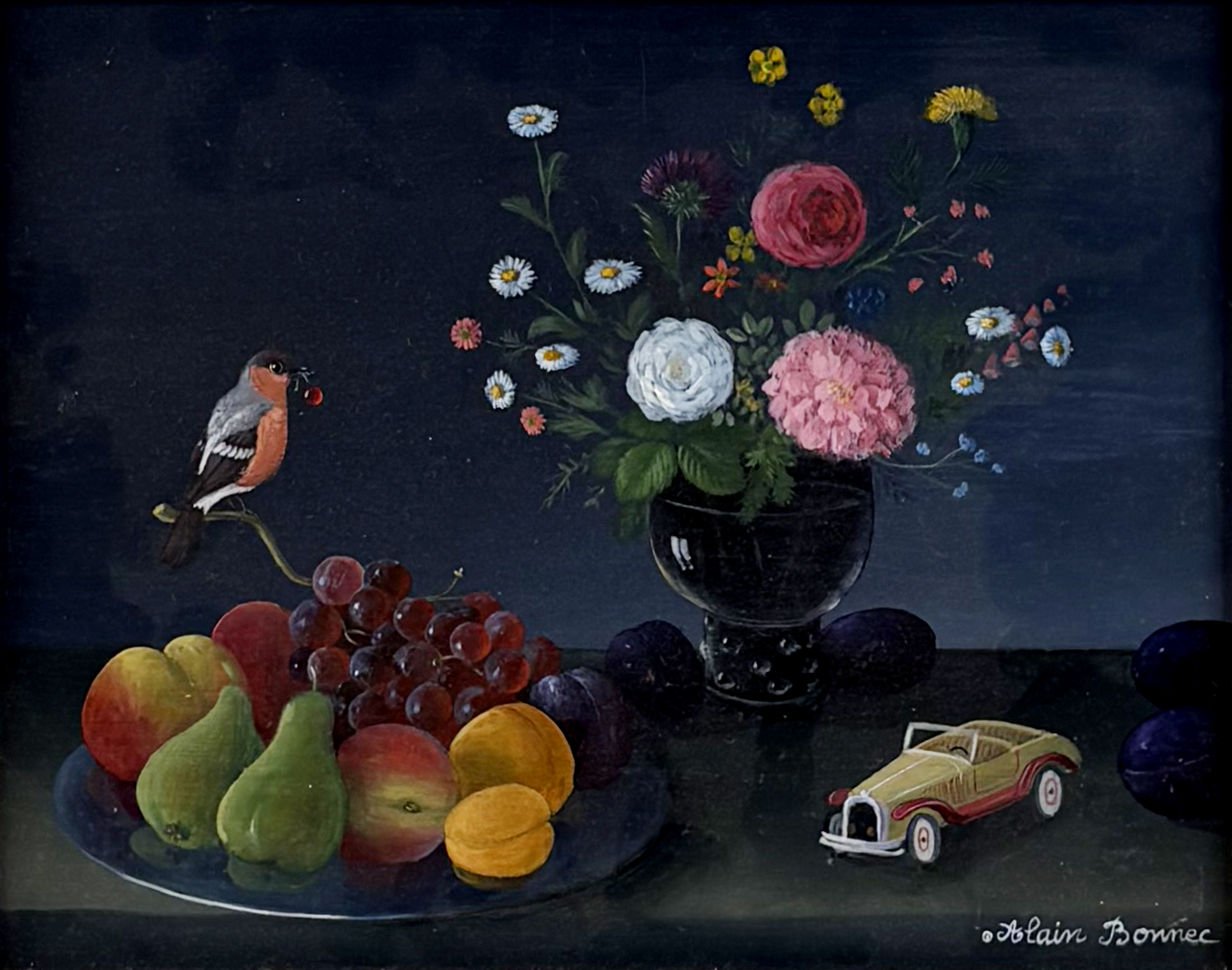 Nature morte à la voiture, huile sur toile, signée, 19x24 cm