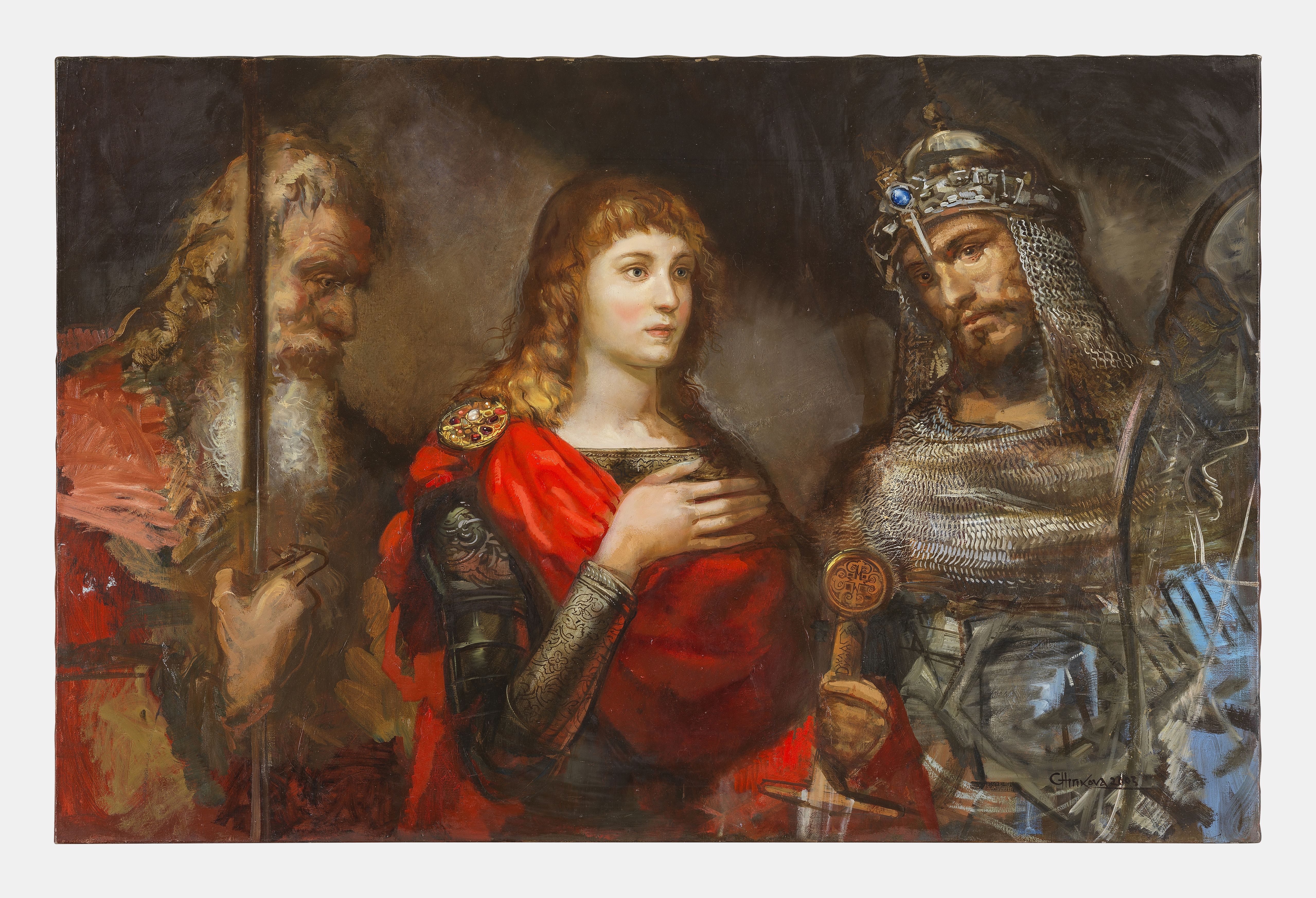 Trois chevaliers, huile sur toile, signée et daté 2003, 80x120,5...