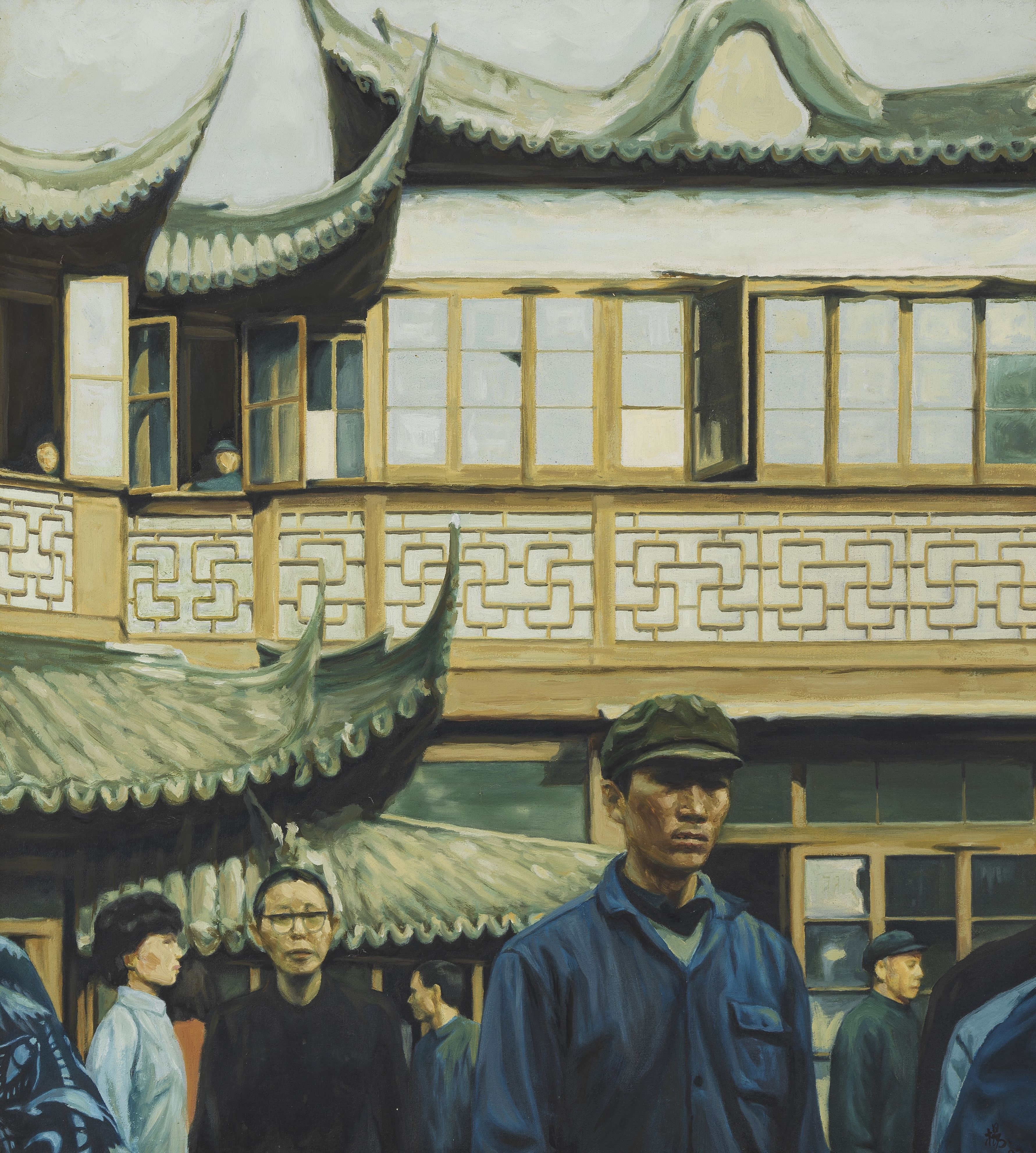 Shanghai city temple, huile sur toile, signée et datée 82, 68x62...