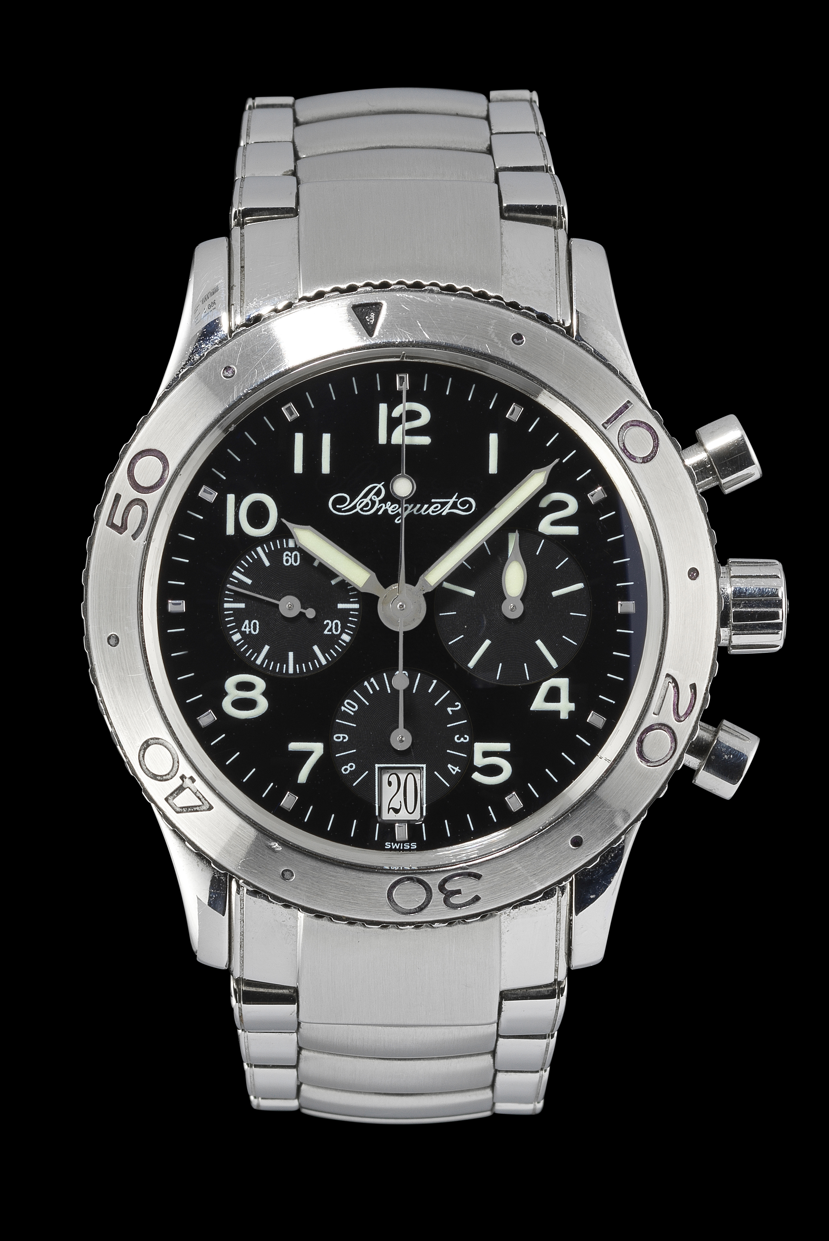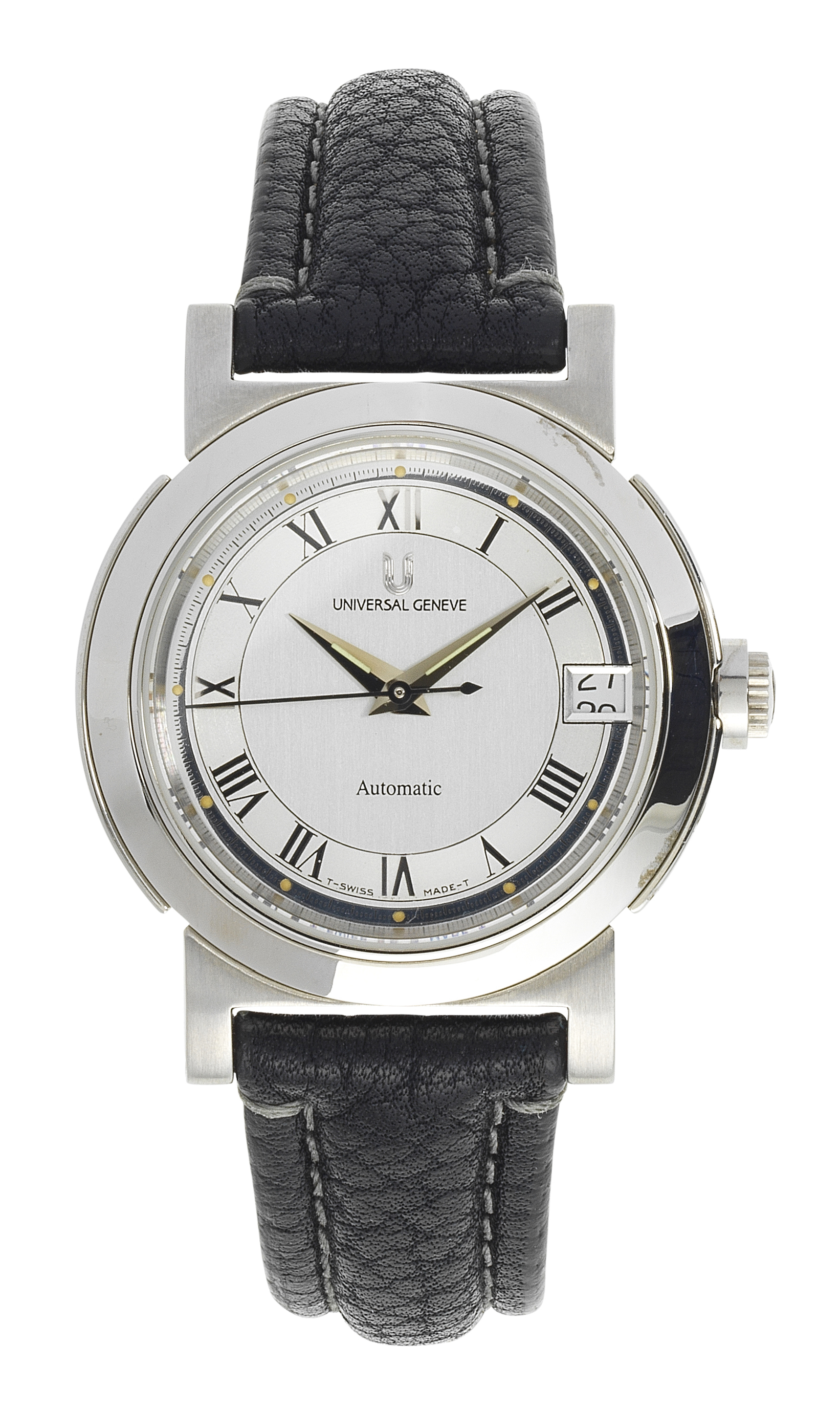 Cadran gris, aiguilles bleuies, index bâtons noirs, métal chromé...