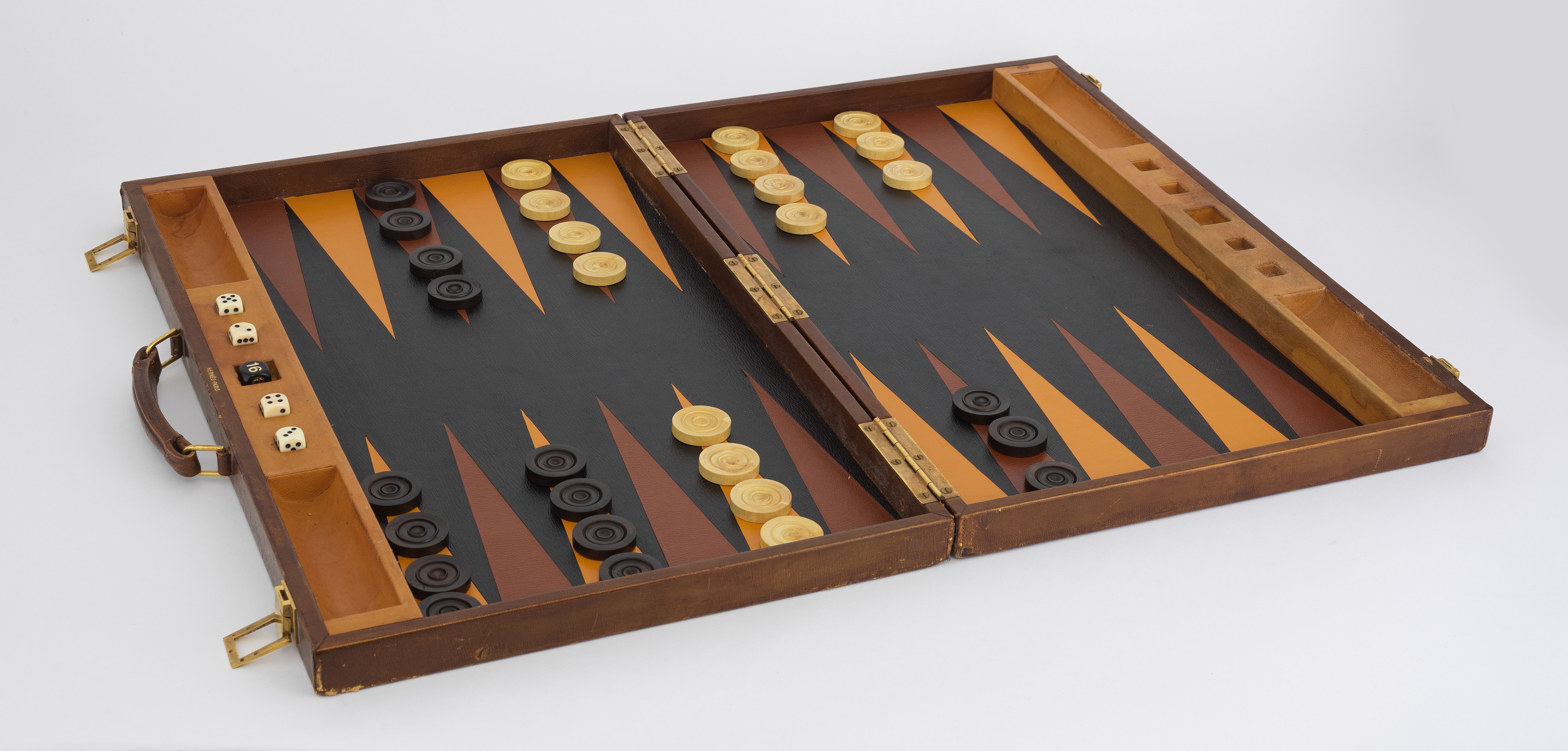Boîte en cuir, garnitures en métal doré, pièces en bois et résin...