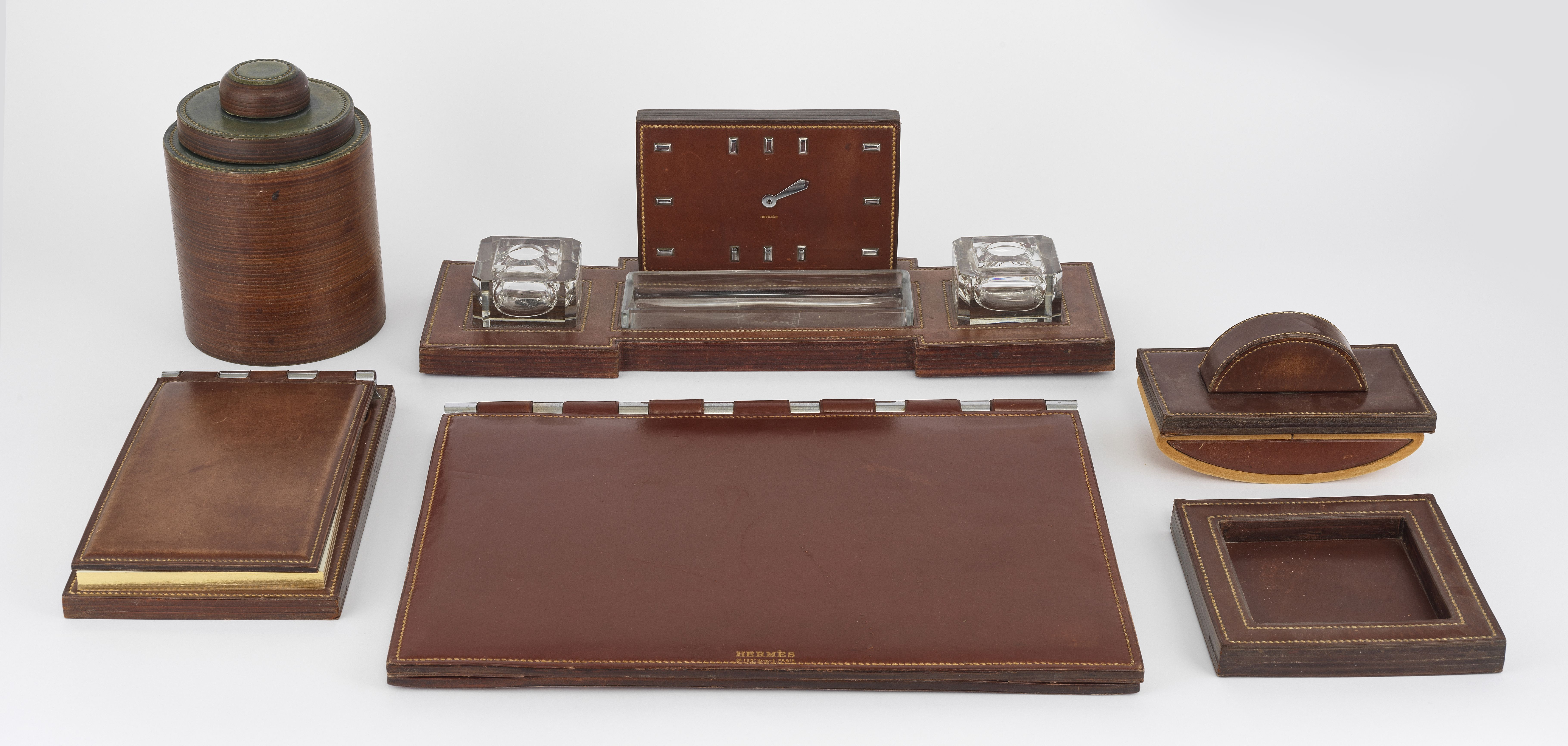 Cuir brun piqué, comprenant: sous-mains, pendulettes, encrier, v...