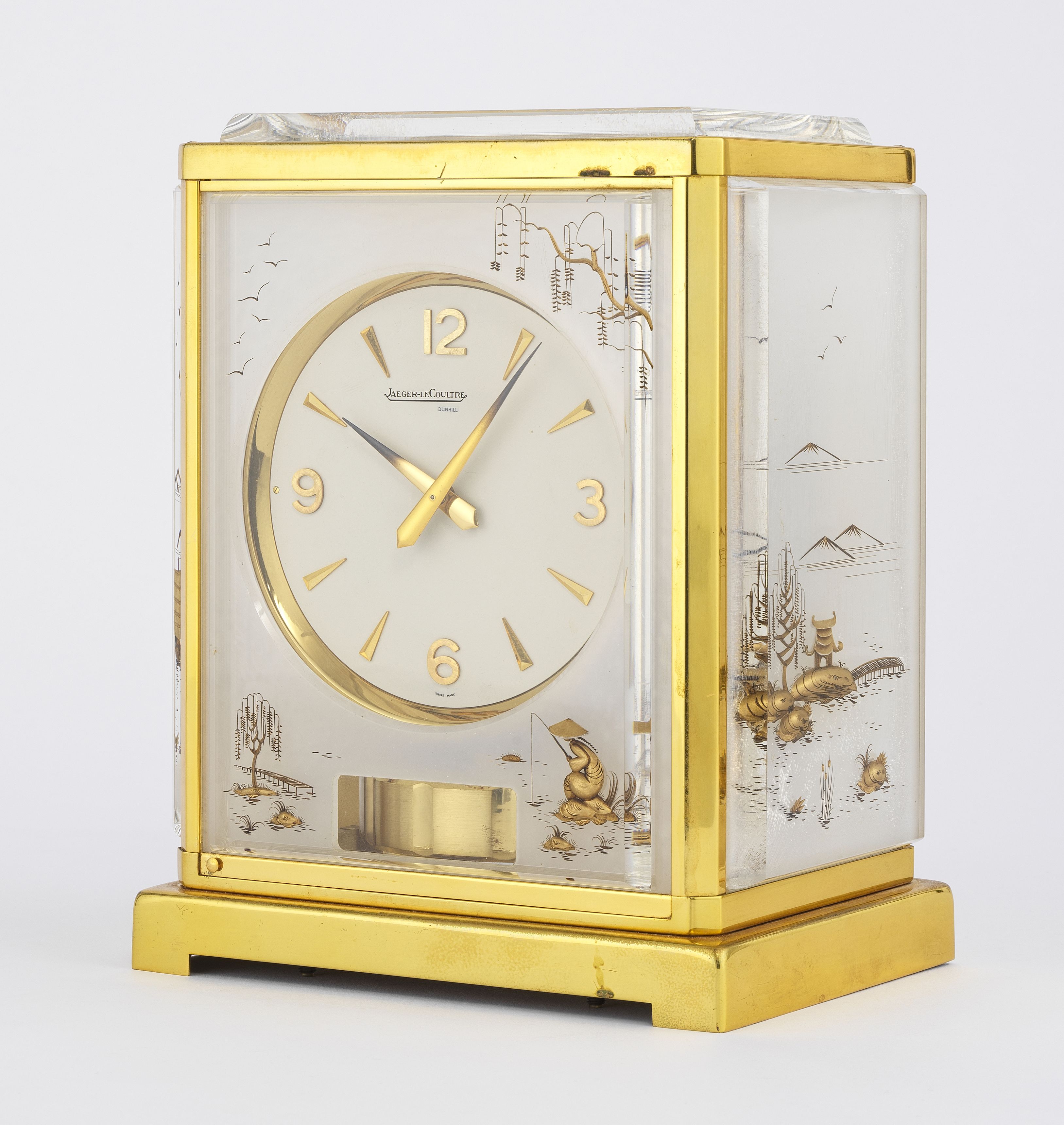 4851. Jaeger-LeCoultre, Atmos, Marina, pendule cabinet doré à décor ja...