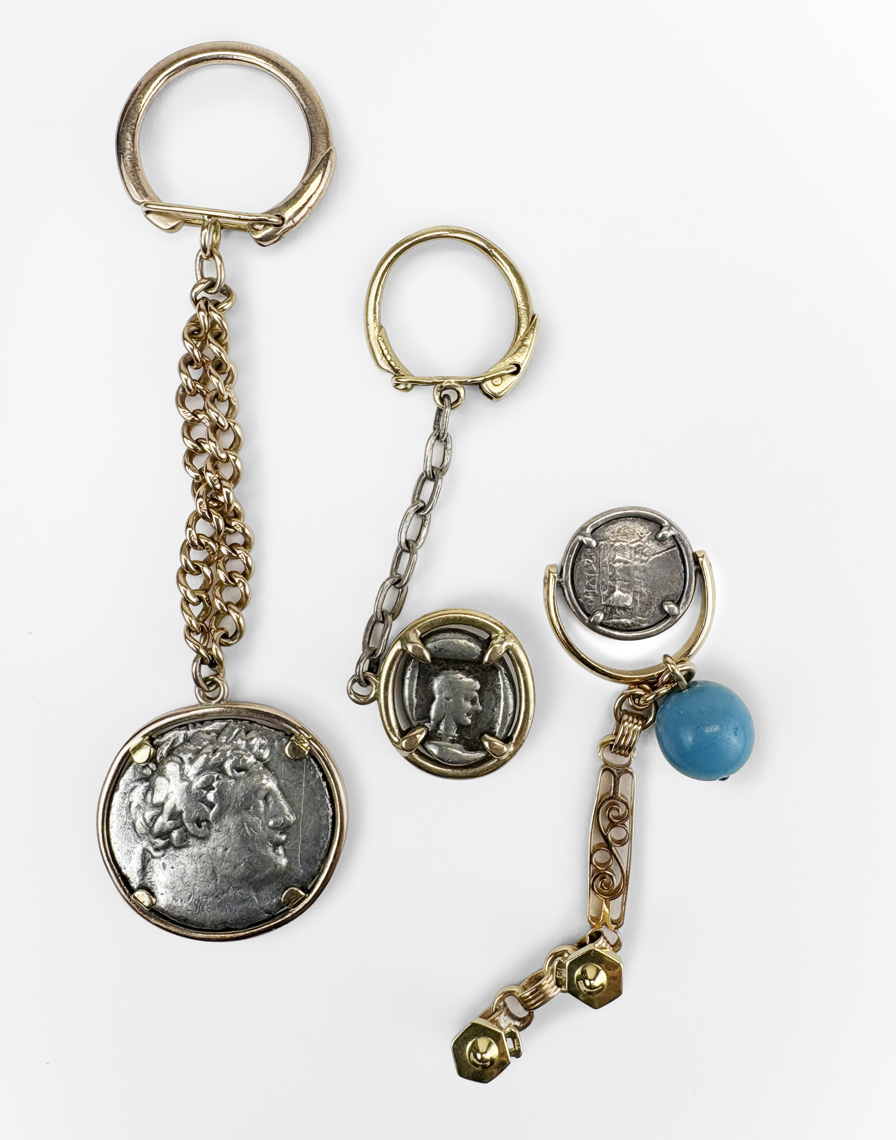 4870. Lot de trois porte-clés sertis de pièces probablement antiques