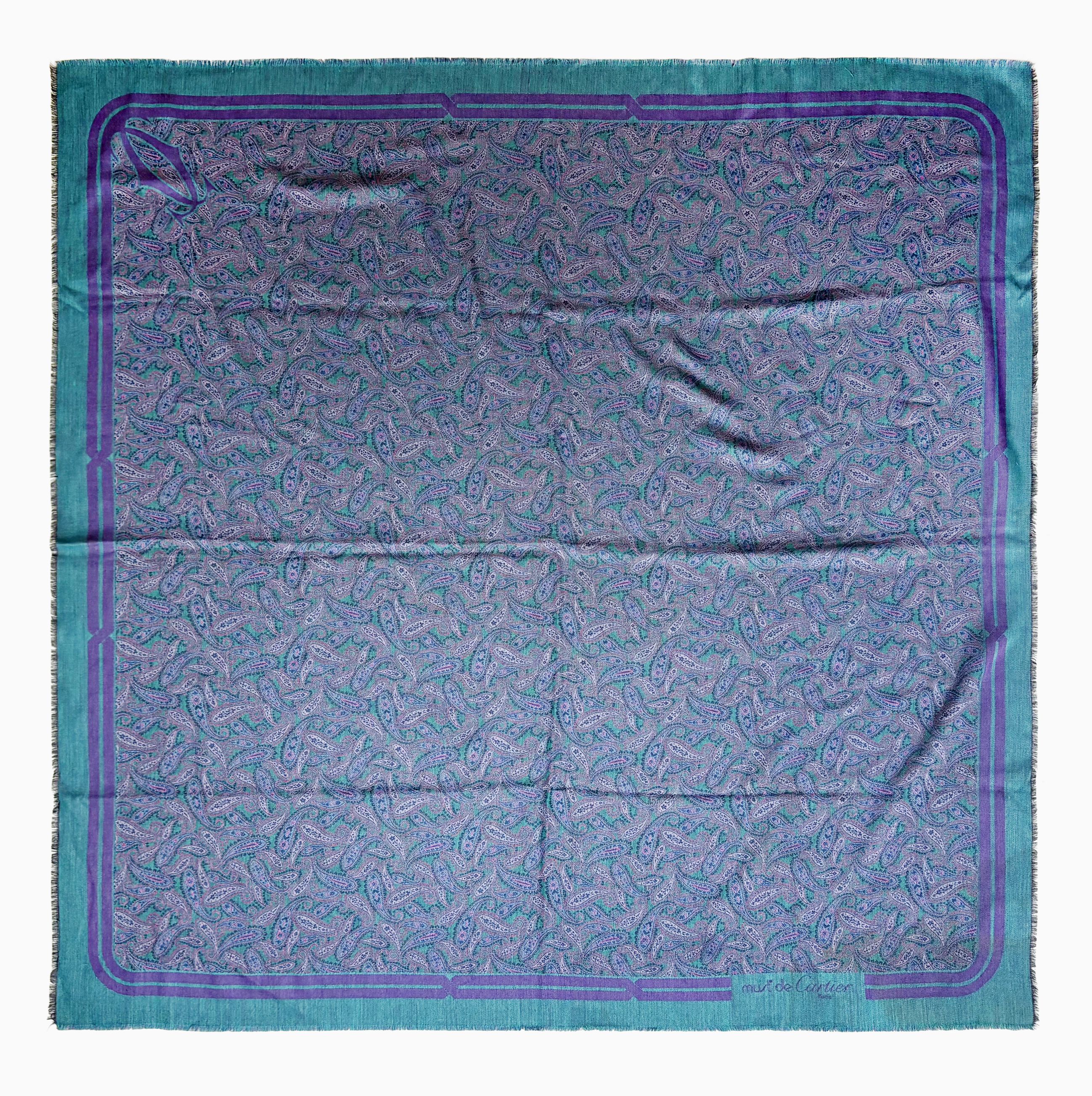Carré à motif de paisleys sur fond vert, laine et soie, 140x140...