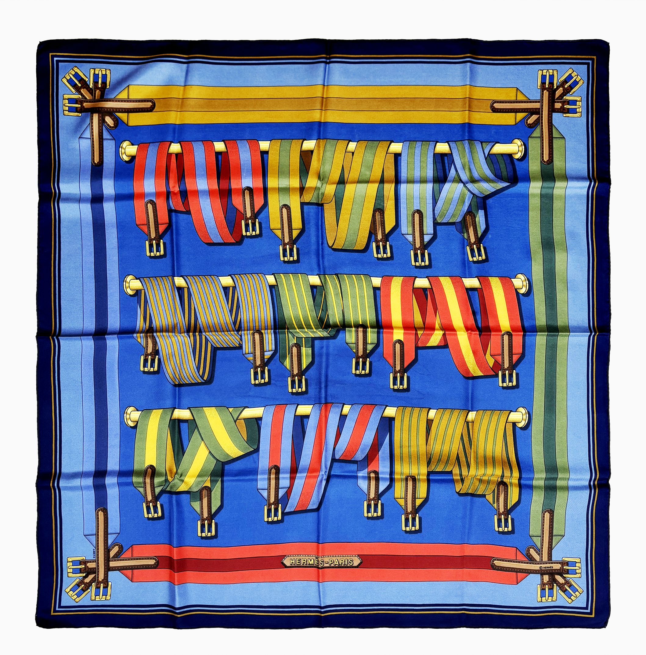 Carré à décor de sangles équestres sur fond bleu, soie, 85x85 cm
