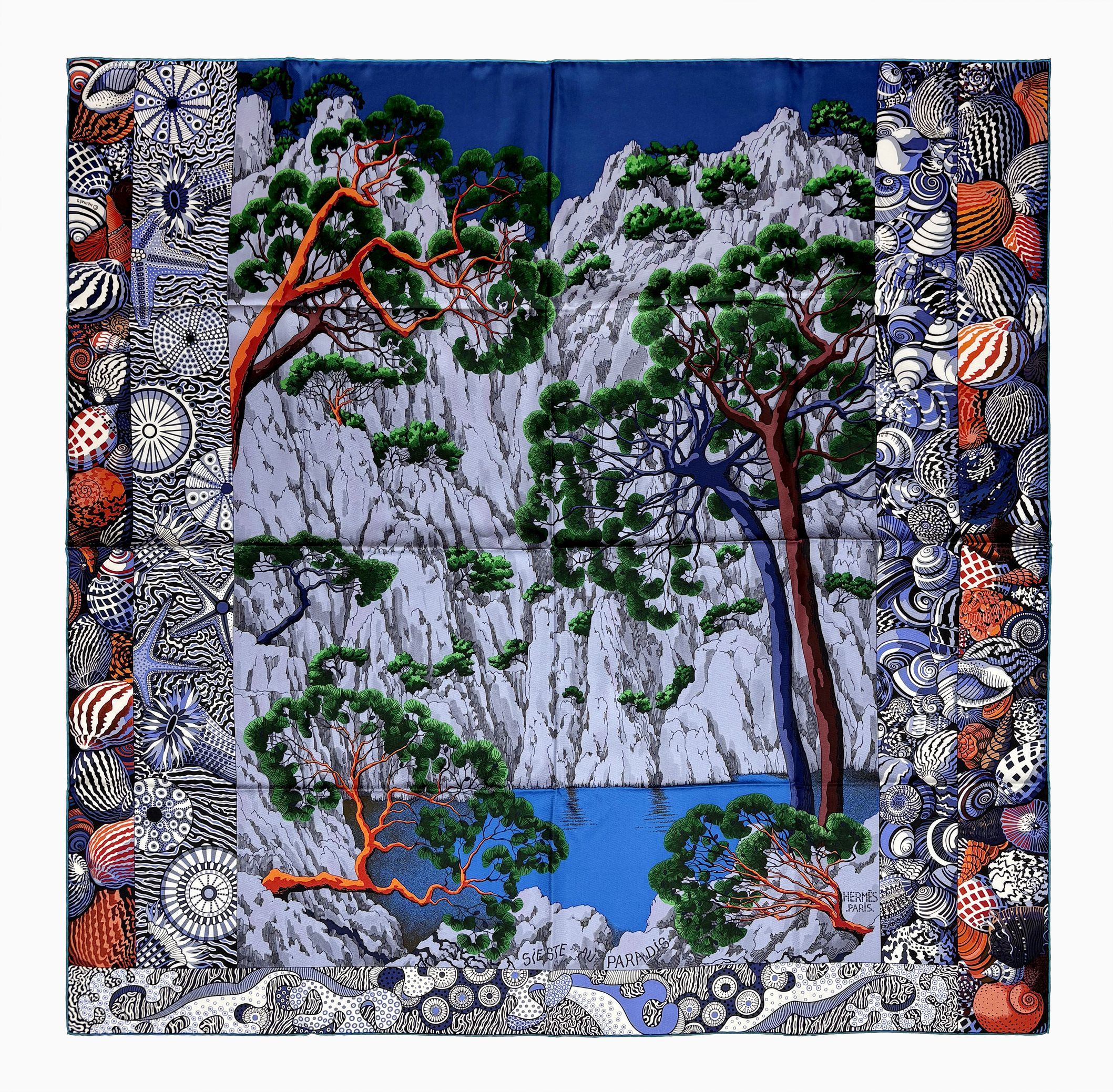Carré à décor de paysage rocheux et coquillages sur fond bleu ma...