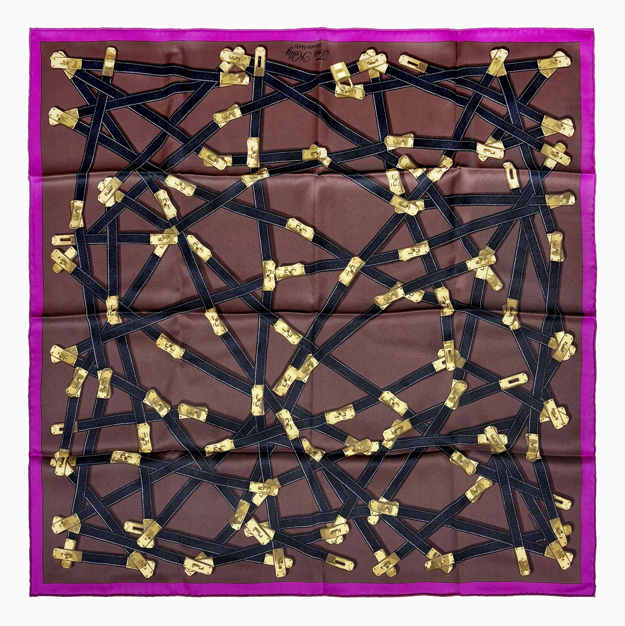 Soie, le carré "Très Kelly" à décor de fermoirs Kelly sur fond m...