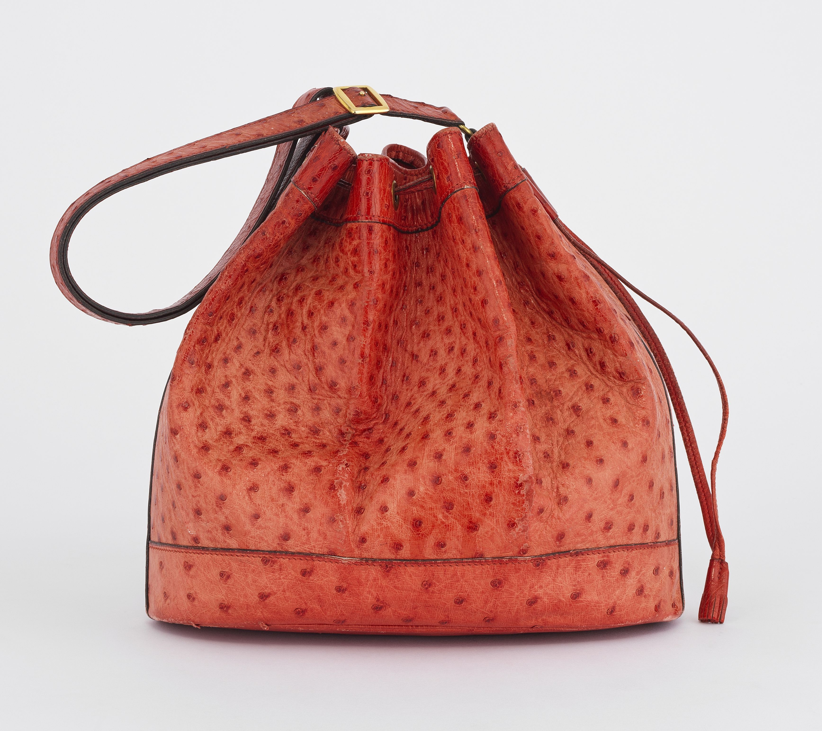 Cuir d'autruche rouge, garniture en métal doré, 27x28x15 cm