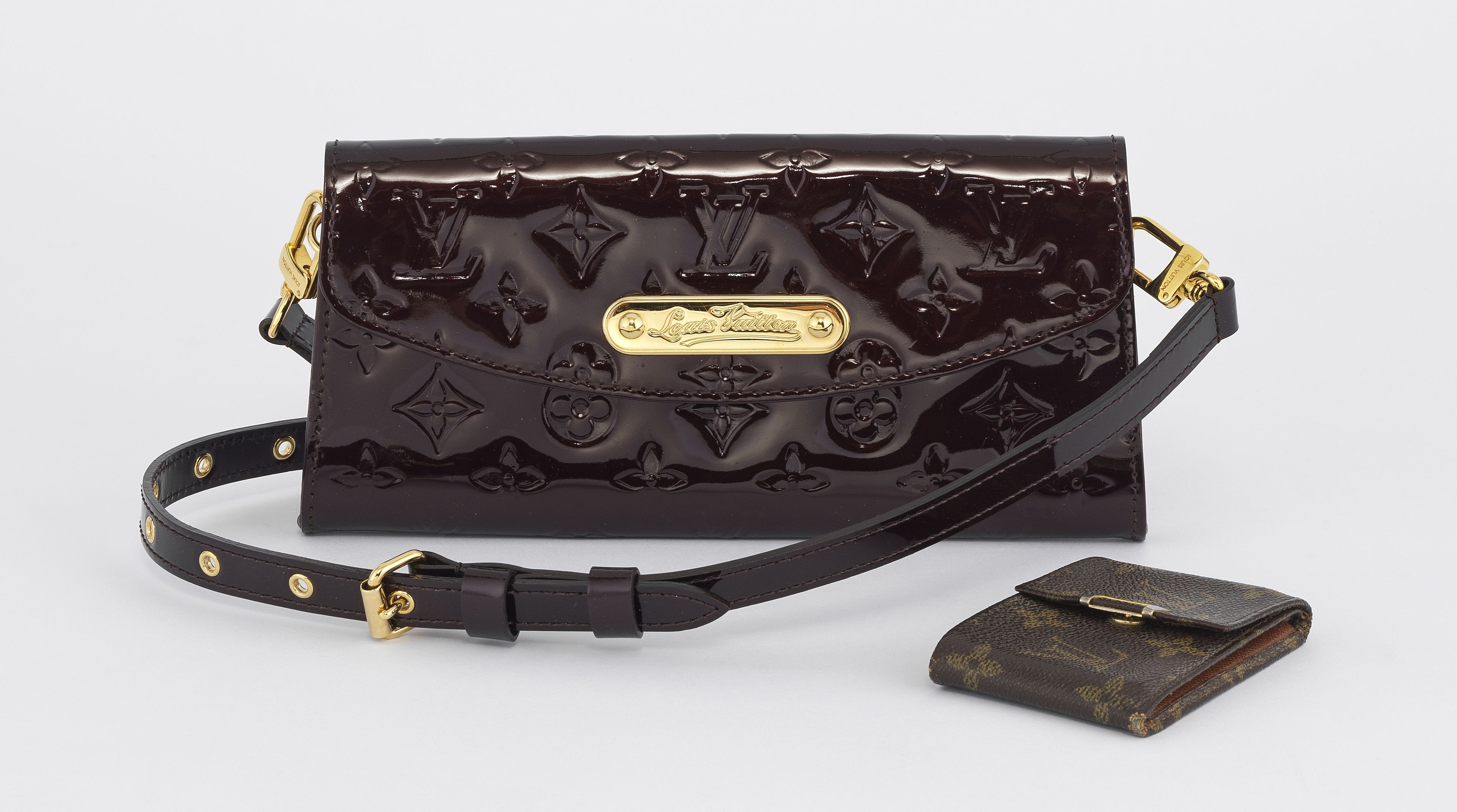 Cuir verni bordeaux, garniture en métal doré, anses détachables...