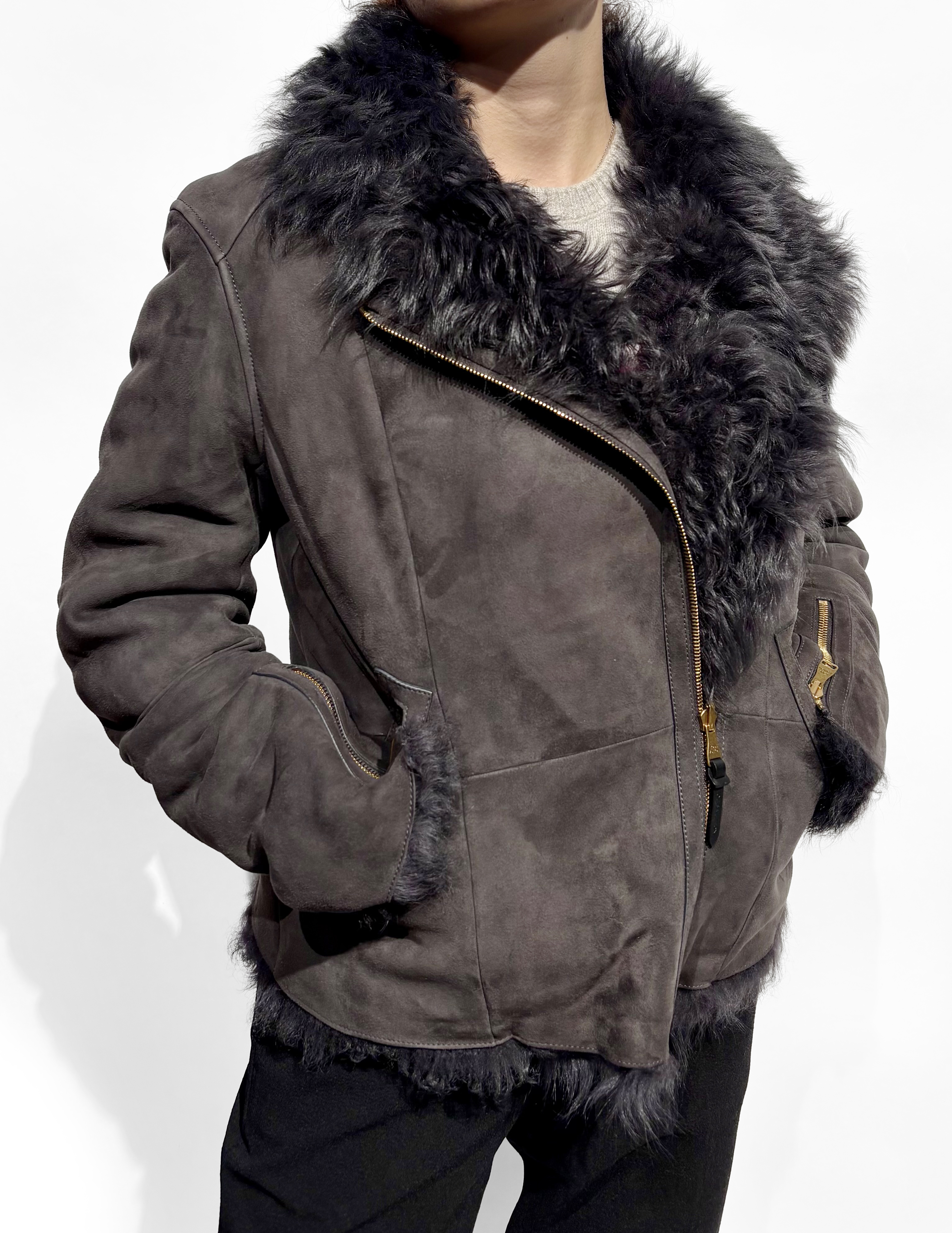 Daim gris doublé de fourrure, poches latérales, fermeture éclair...