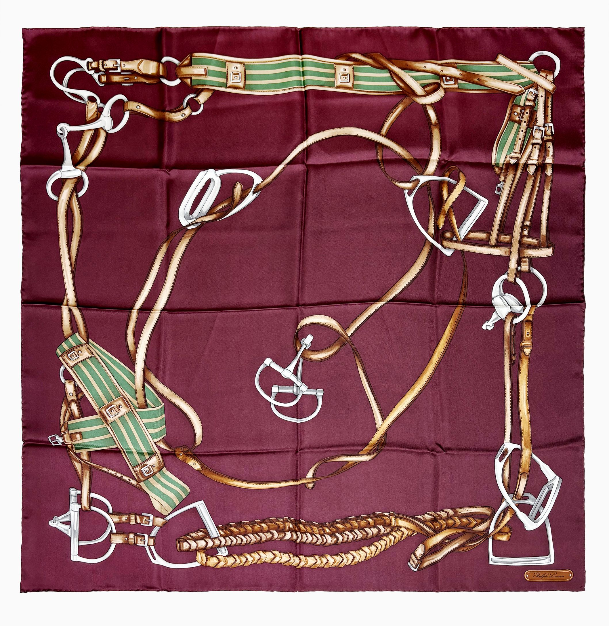 L'un carré à décor d'arnachement équestre sur fond bordeaux, l'a...