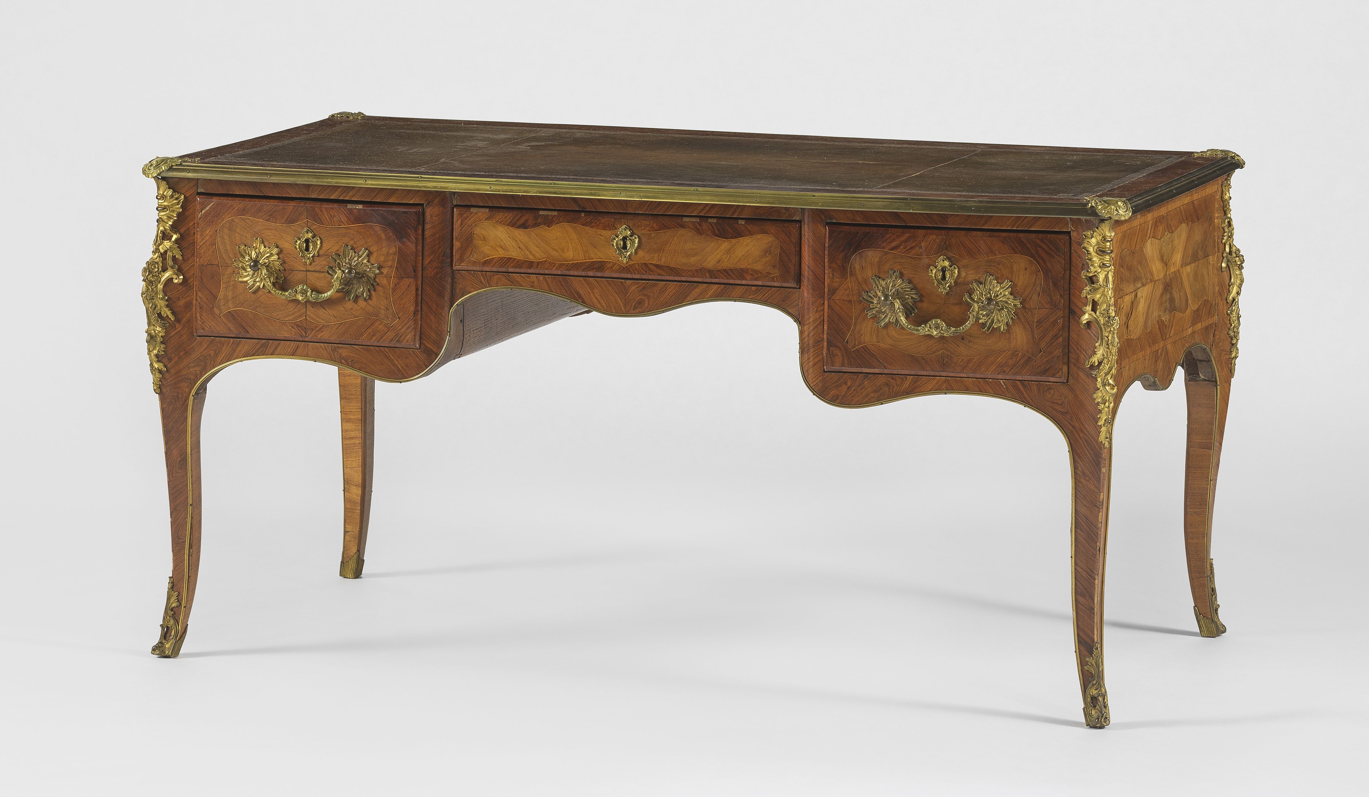 Un tiroir, cuir doré au petit fer, bois de rose et bronze doré,...