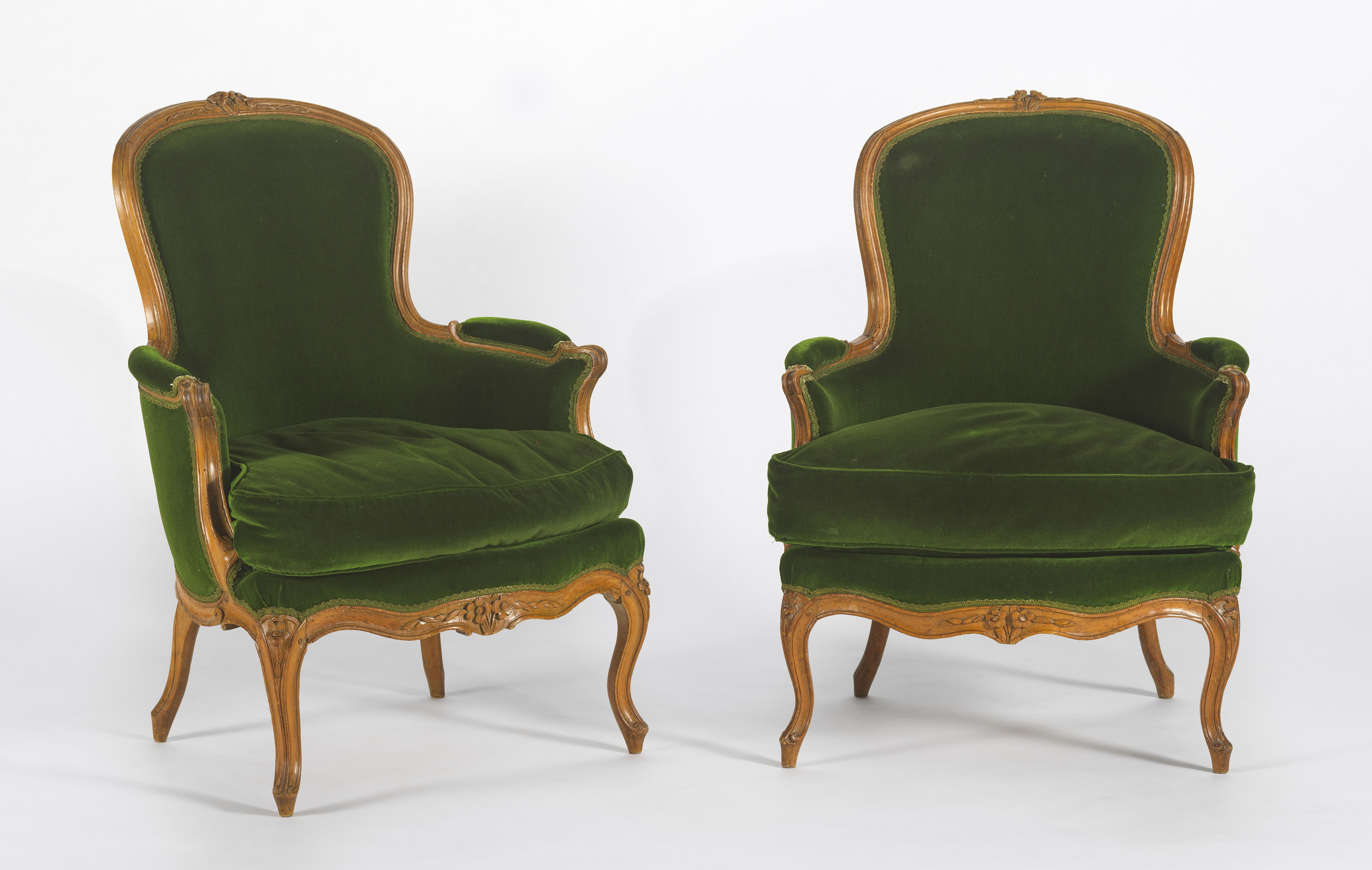 Hêtre mouluré et sculpté, garniture en velours vert, l'une estam...