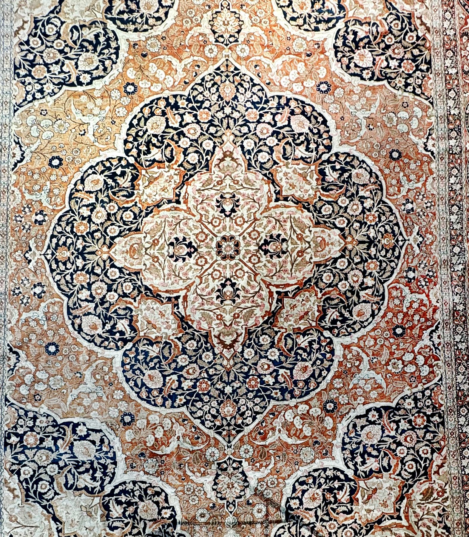 Champ central orné de cinq médaillons sur fond bleu foncé, bordu...