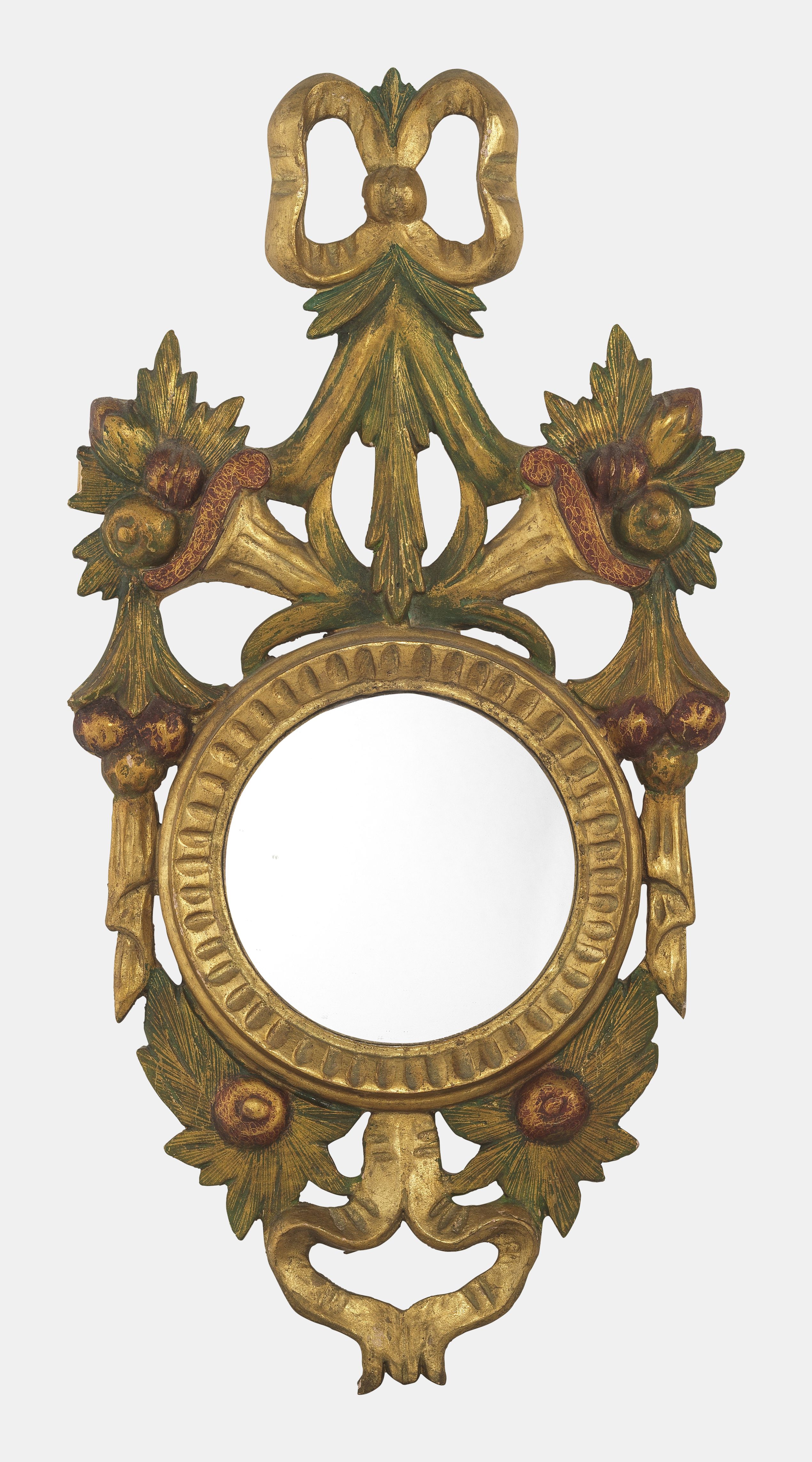 Bois sculpté et peint à décor de noeuds et corbeilles de fruits,...