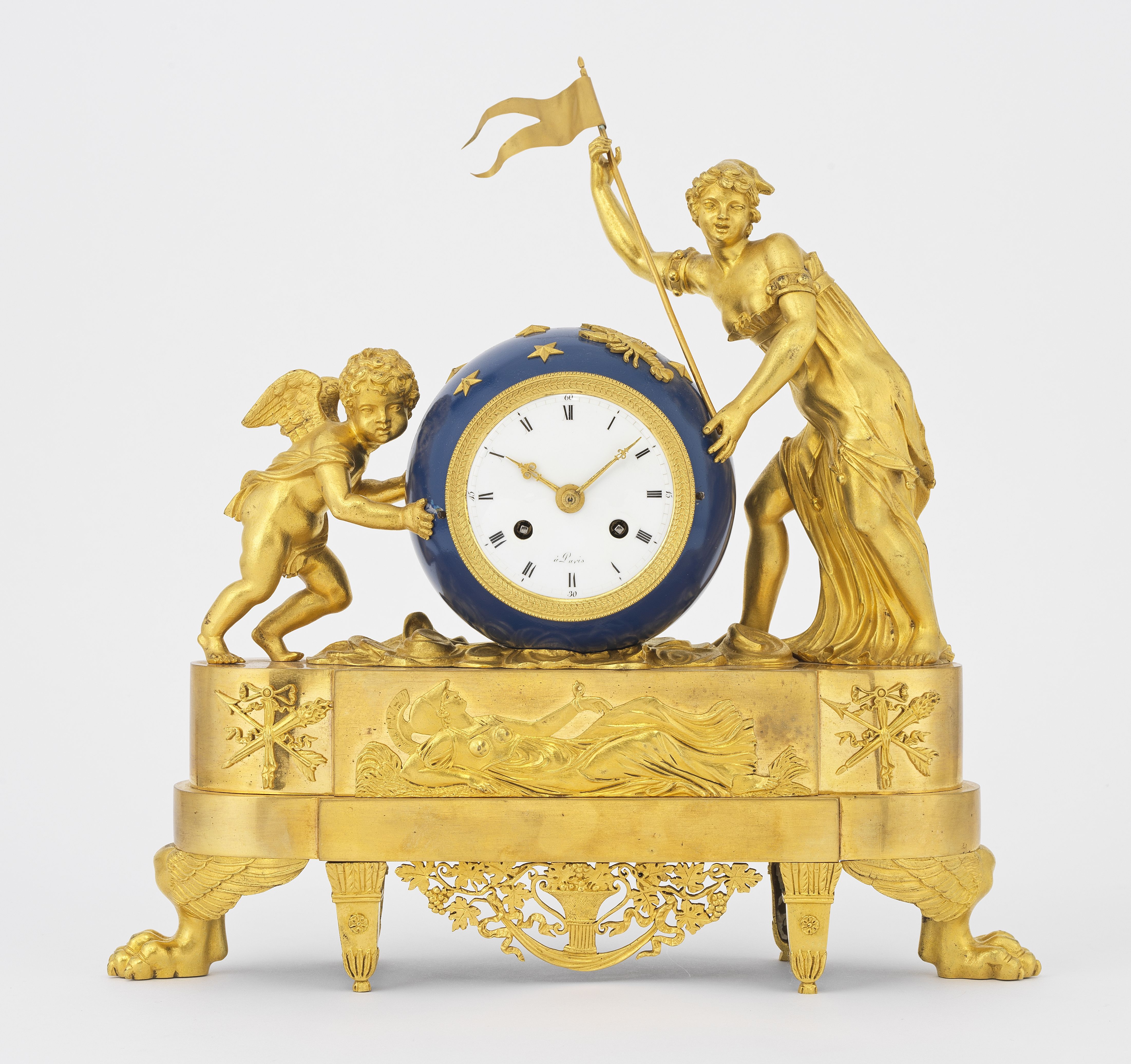 Bronze doré et ciselé, cadran émaillé, drapeau rapporté, mouveme...