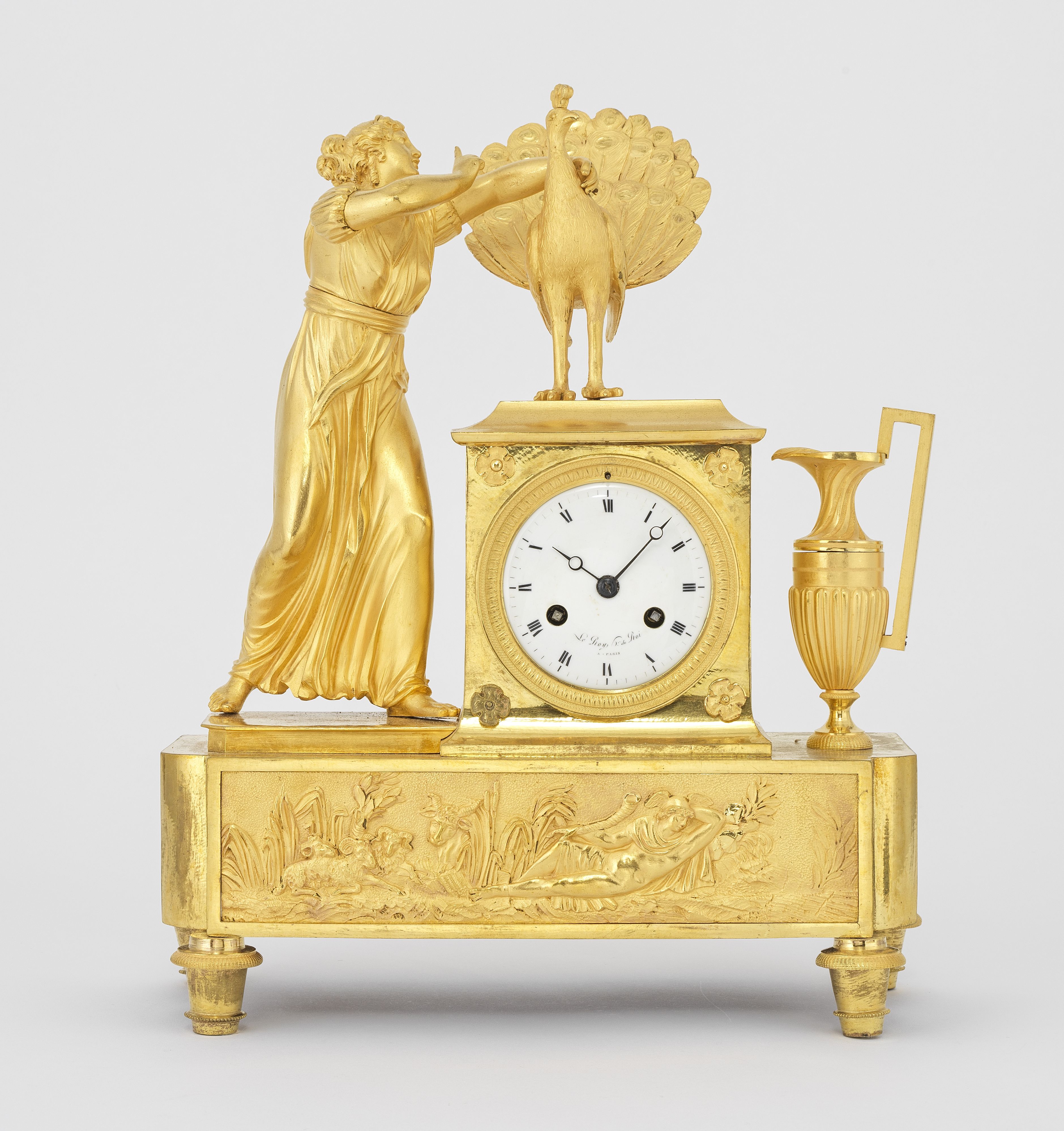 Bronze doré et ciselé, cadran émaillé signé le Roy à Paris, mouv...