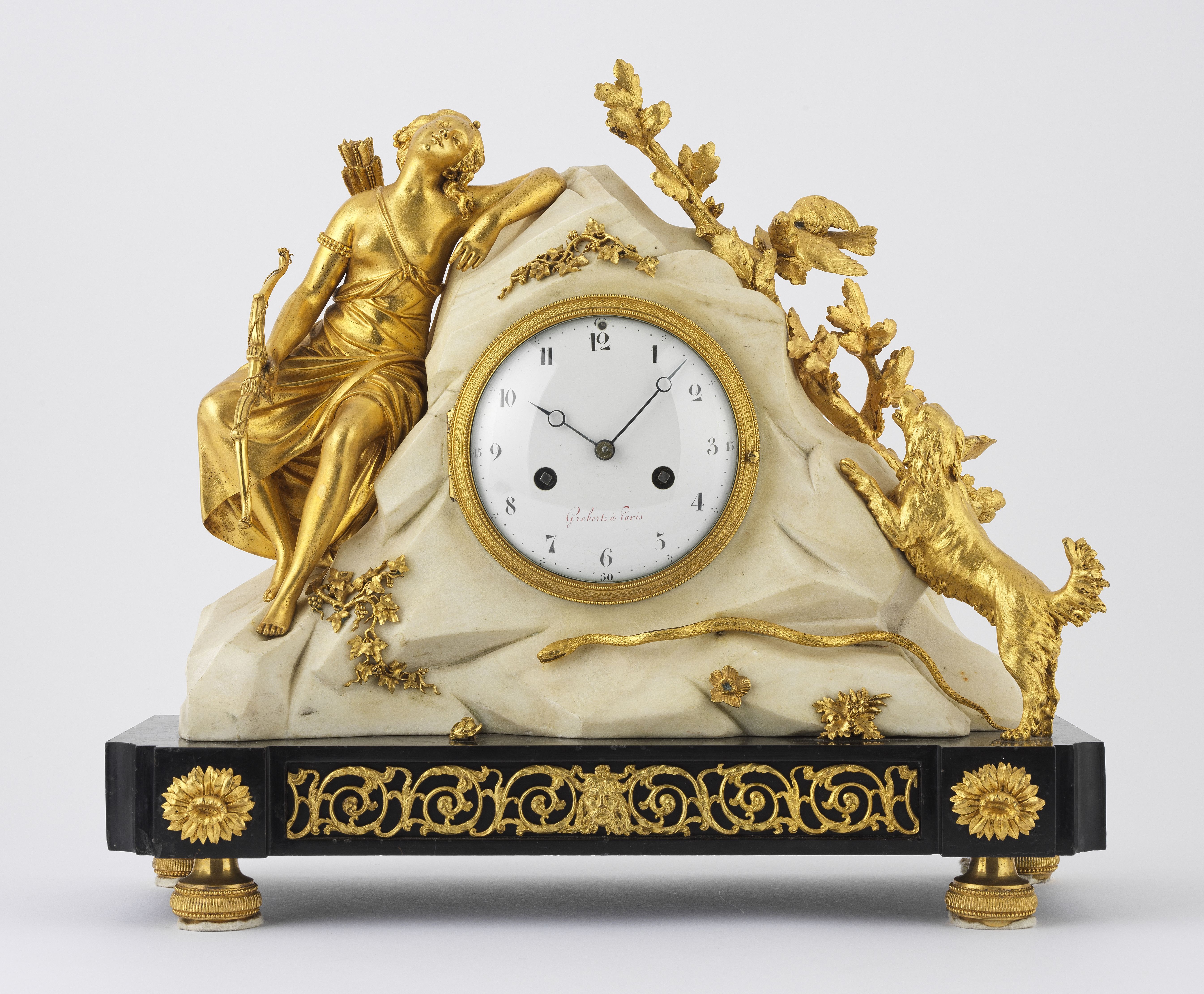 Bronze doré et ciselé, marbre, cadran émaillé signé Grebert à Pa...