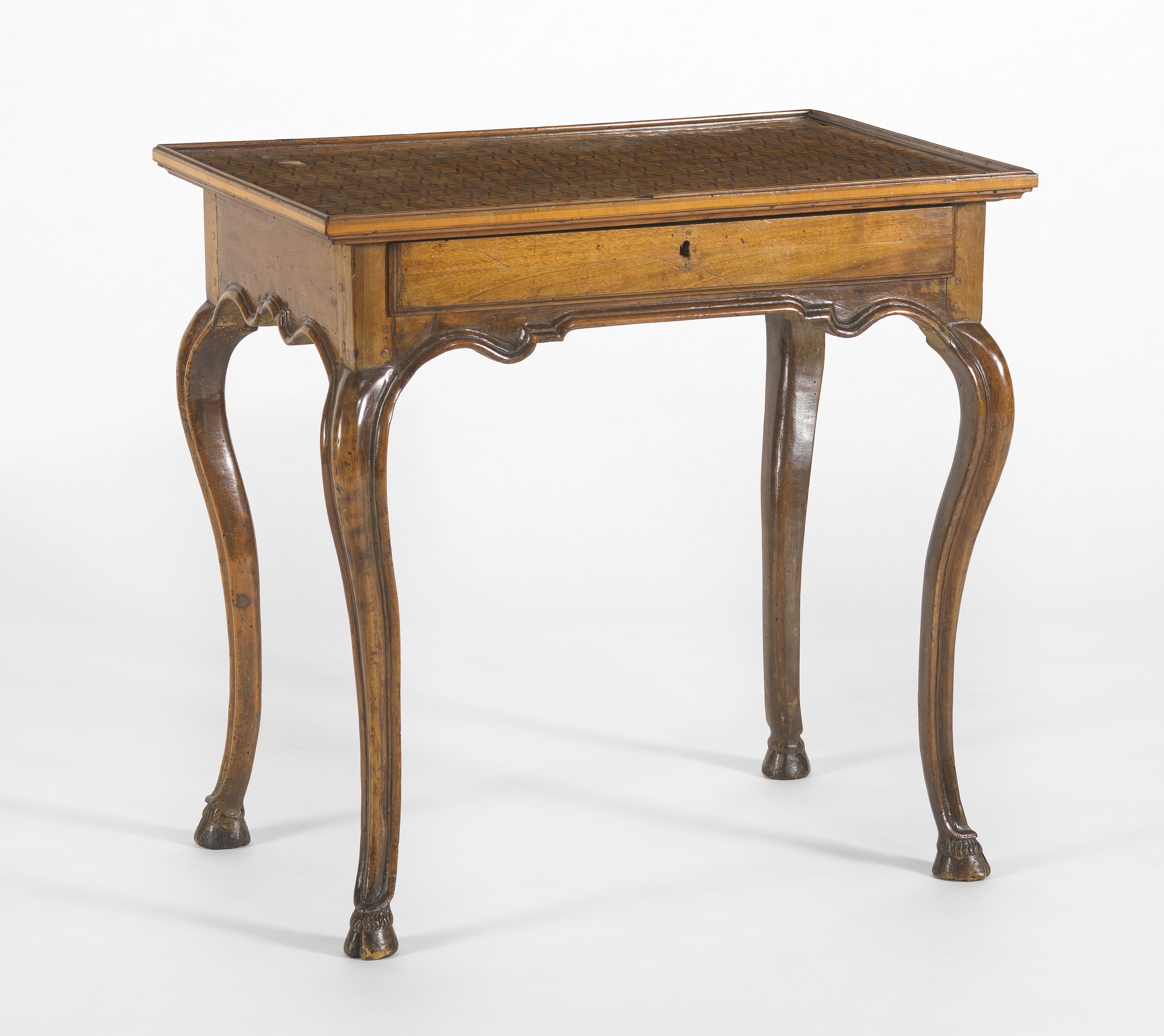 Plateau marqueté de motifs géométriques, un tiroir, bois fruitie...