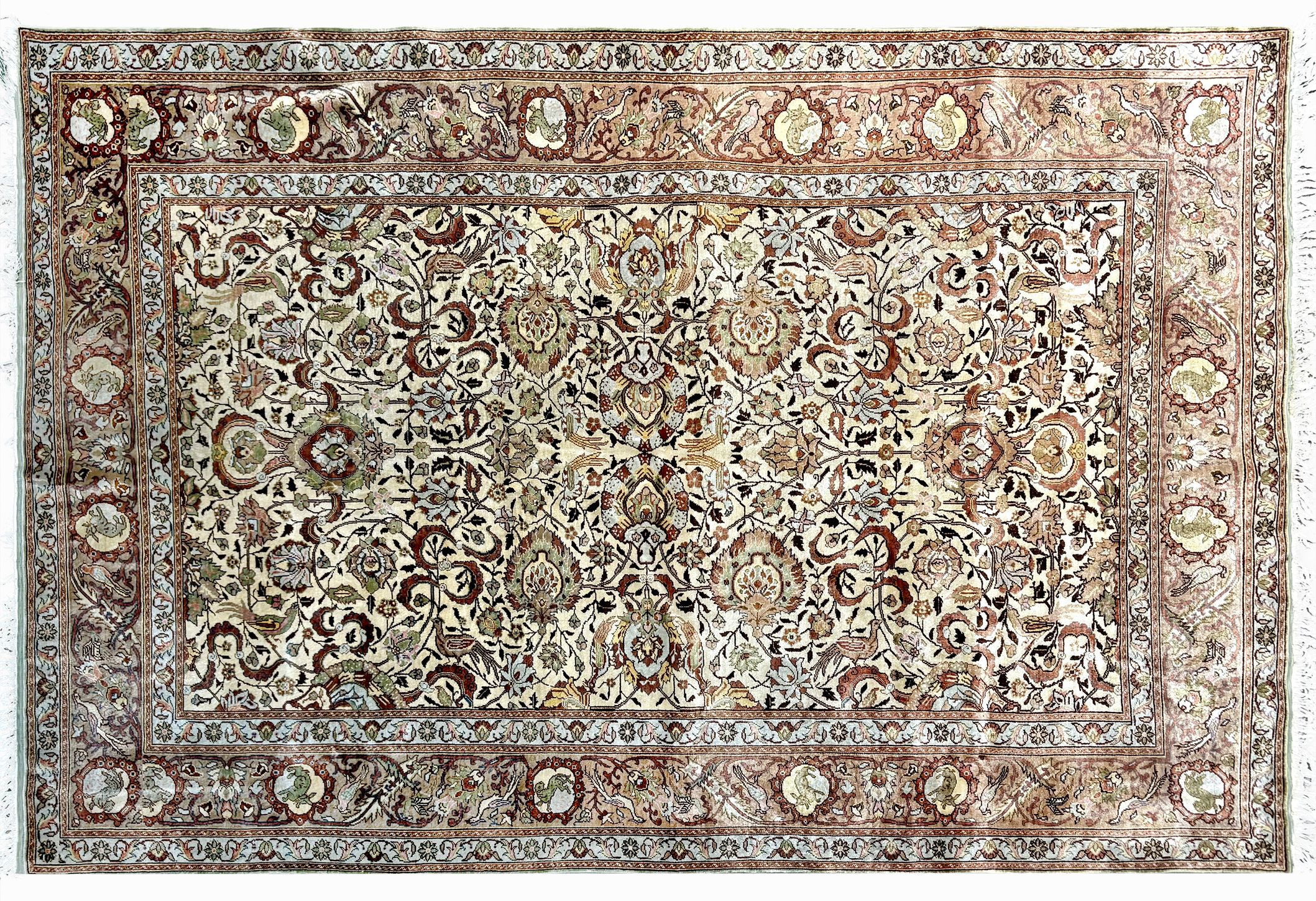 Motif central à fleurs sur fond ivoire, bordure à fleurs, 118x17...