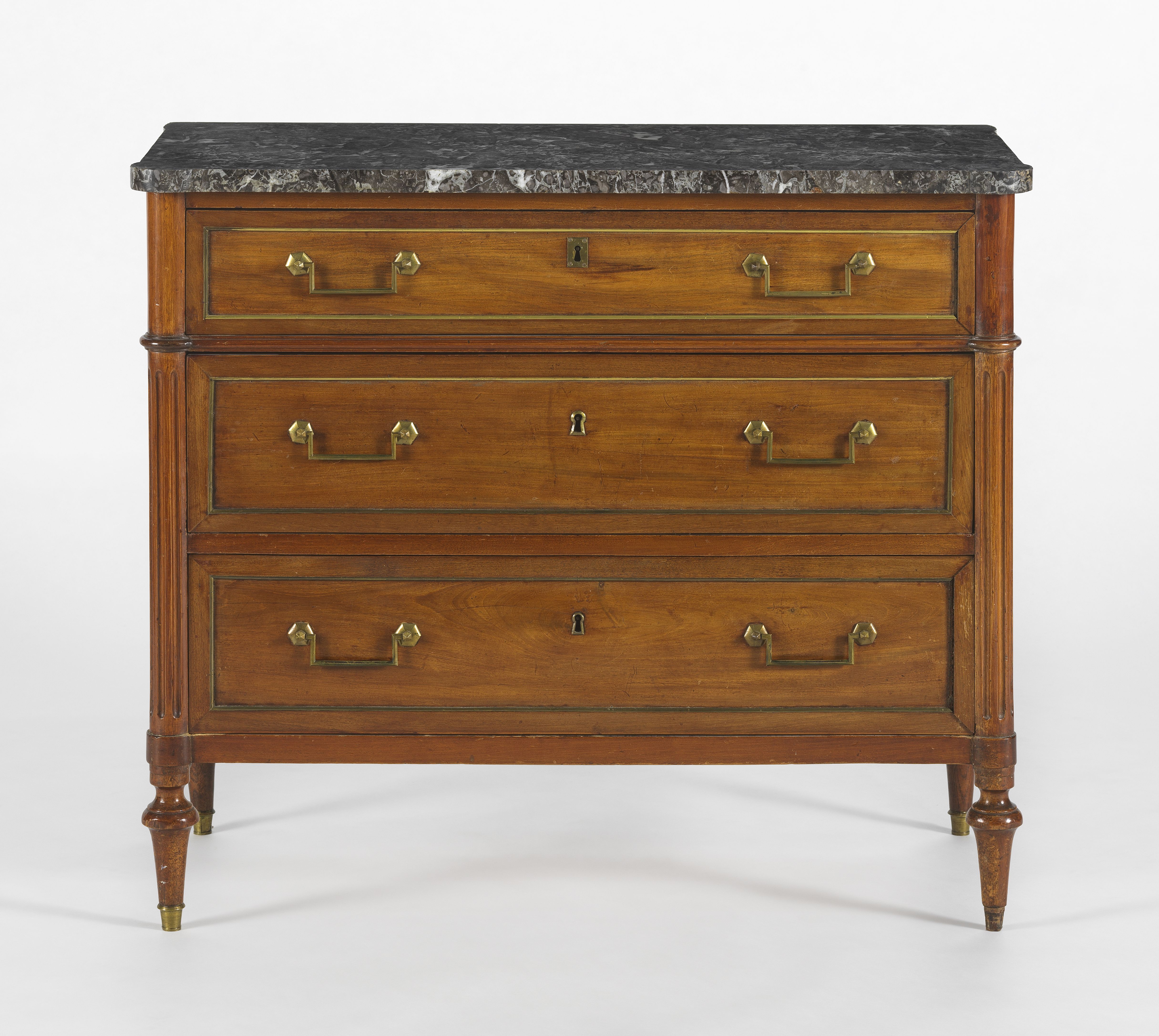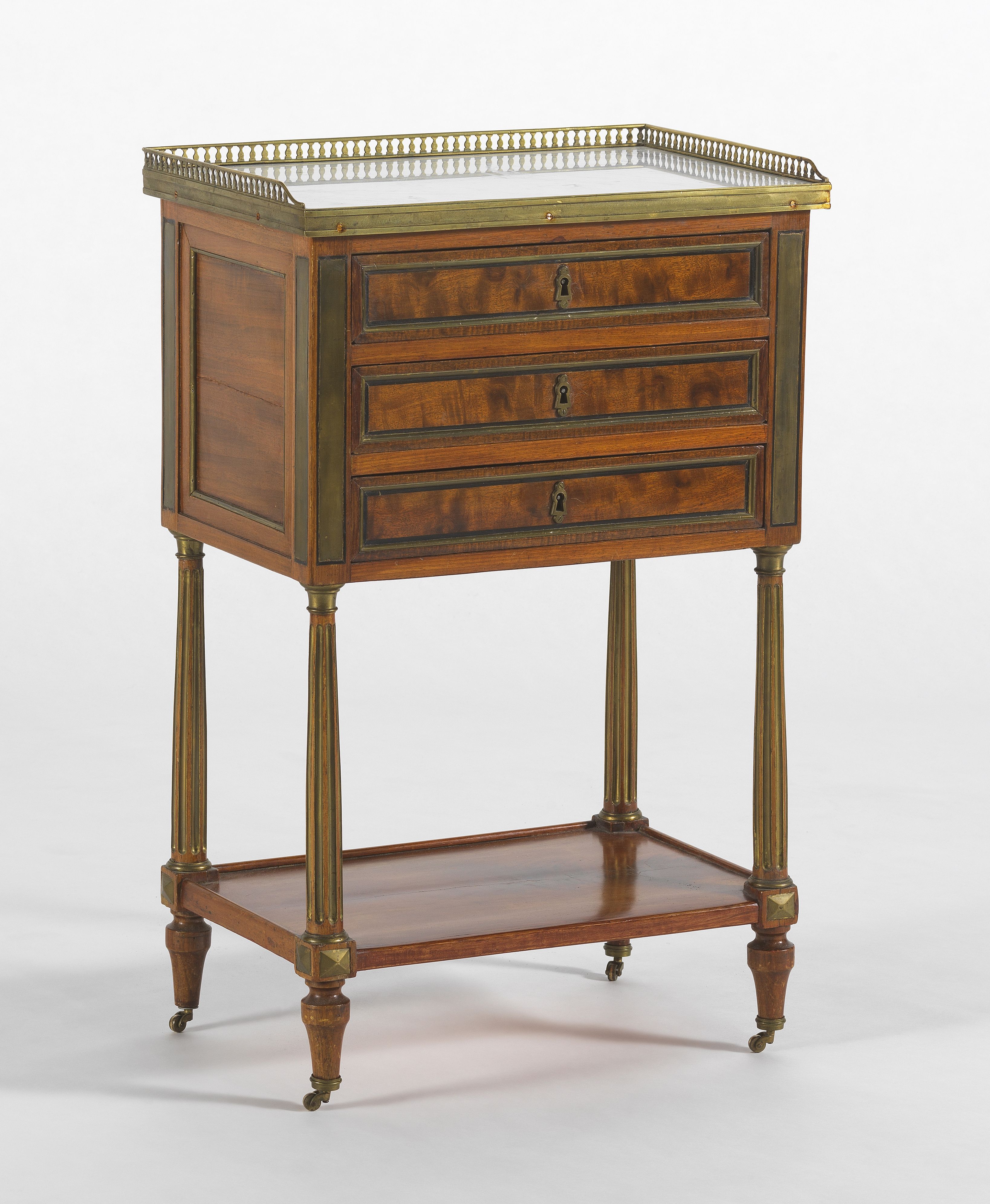 Trois tiroirs, acajou et filets de laiton, plateau de marbre bla...