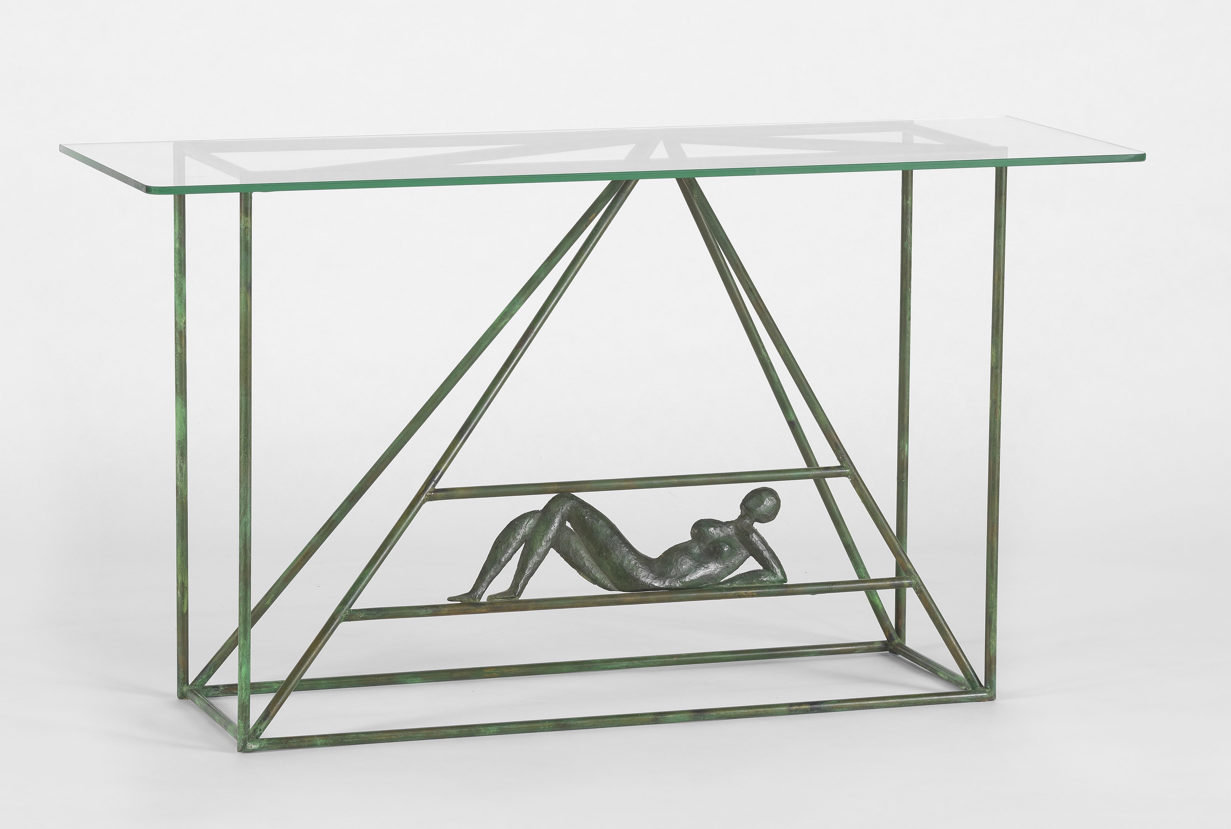 Métal à patine verte figurant une femme allongée, 72x130x46 cm