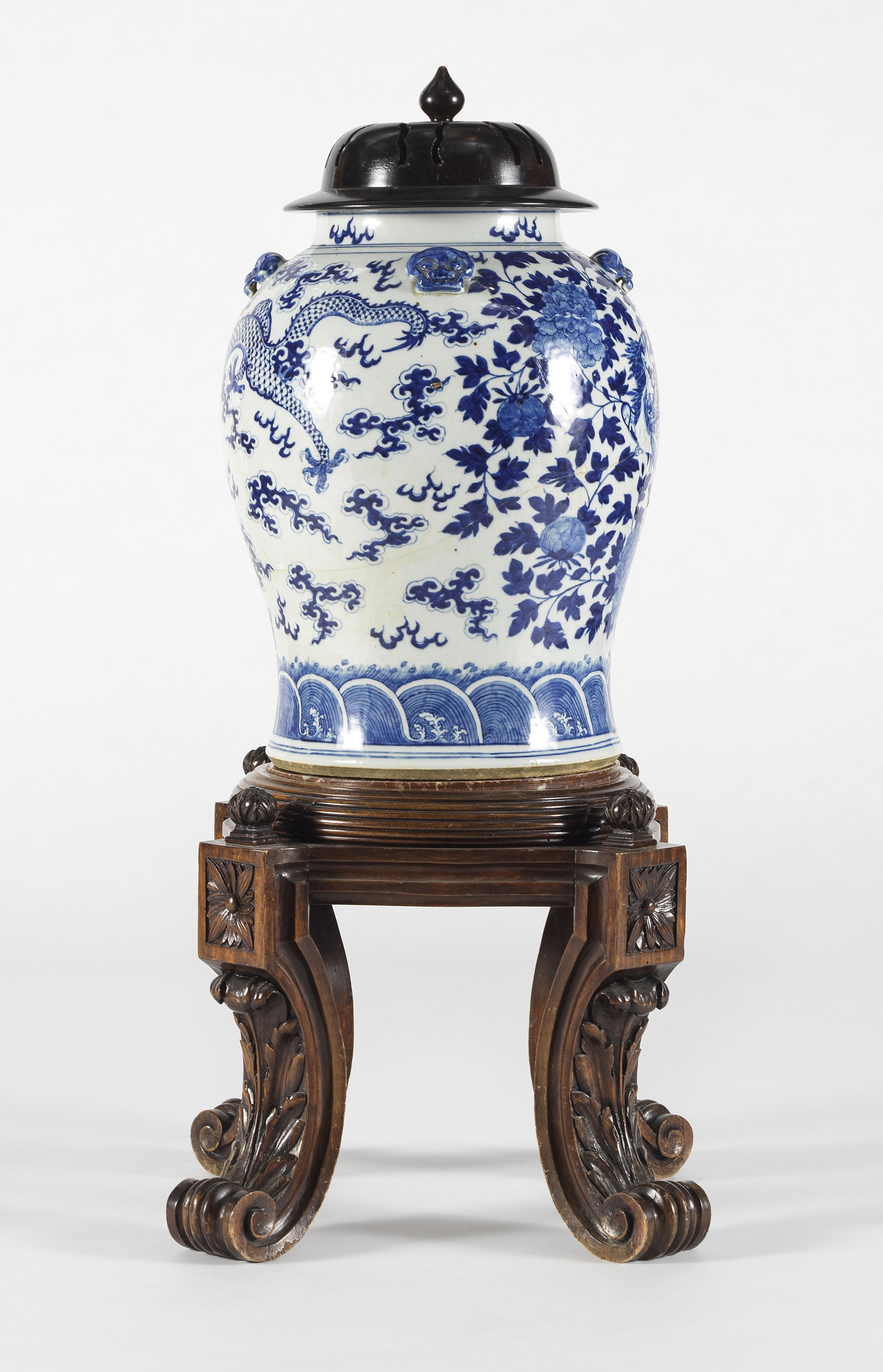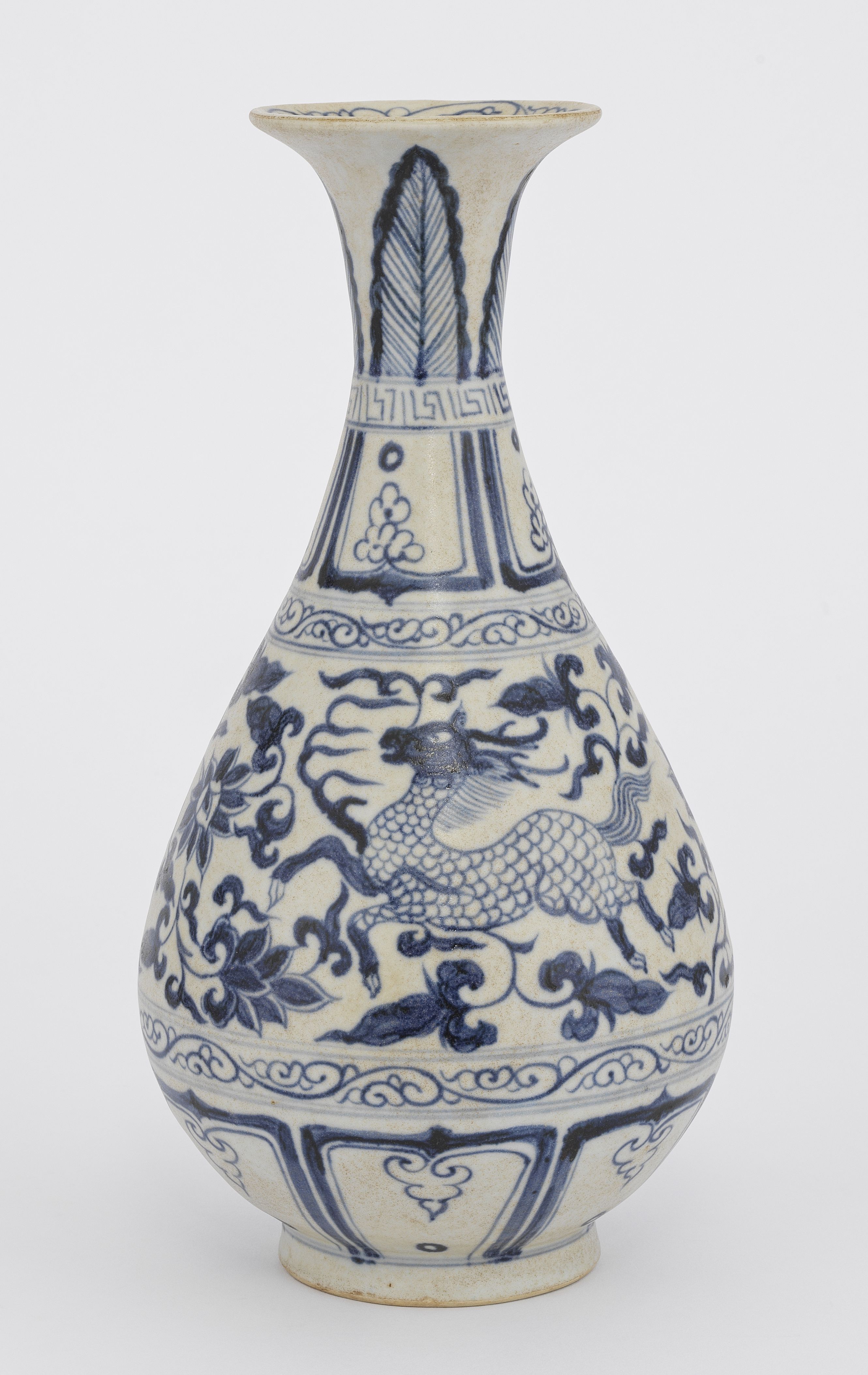 Porcelaine émaillée bleu blanc à motifs d'animaux mythiques, H 2...