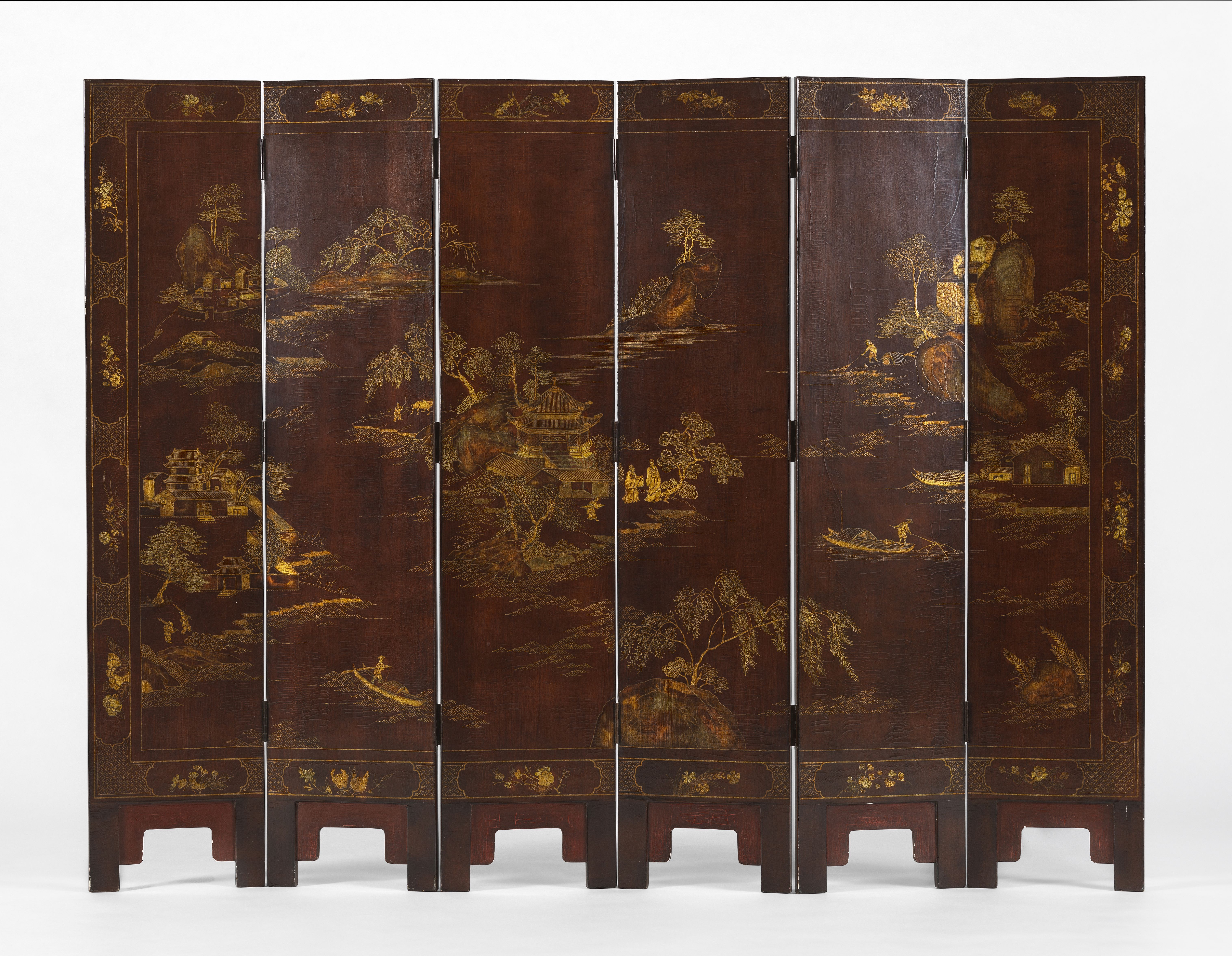Bois laqué à motifs de paysages or sur fond brun rouge, 139x180...