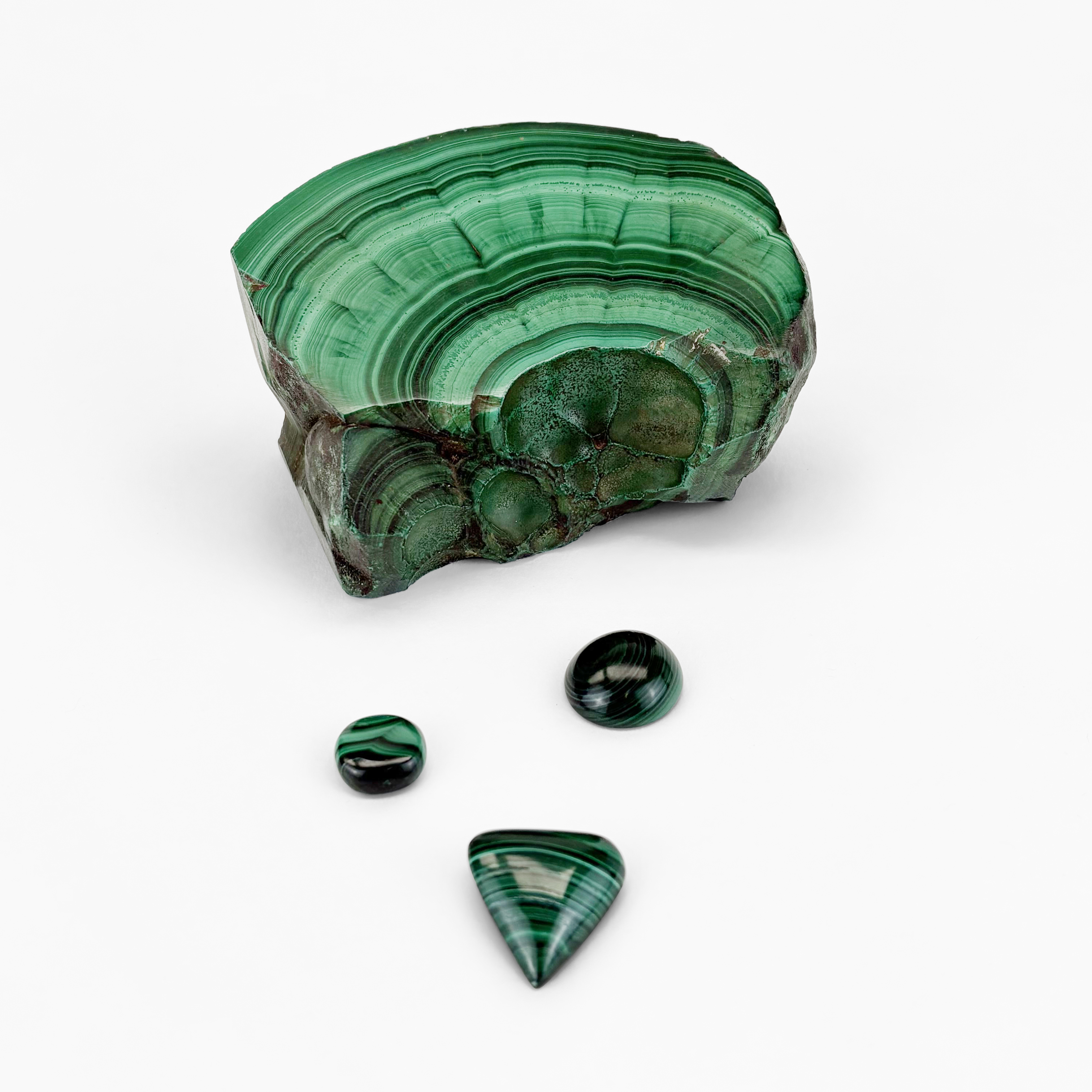 L 12 cm. On joint 3 petites malachites polies, L de 4 à 2 cm.